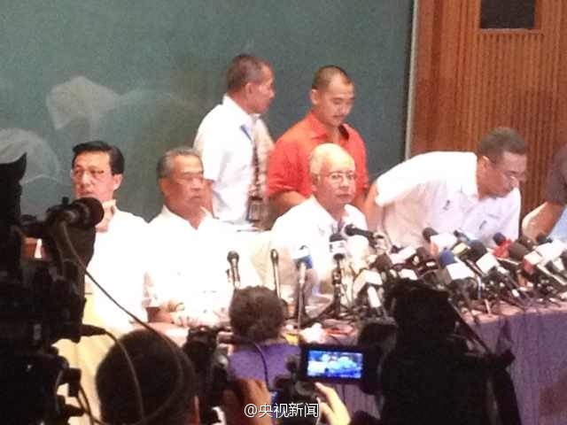 在推遲3個小時之后,馬來西亞總理納吉布19時抵達(dá)現(xiàn)場,就馬來西亞航空飛機(jī)失聯(lián)事件召開記者會。