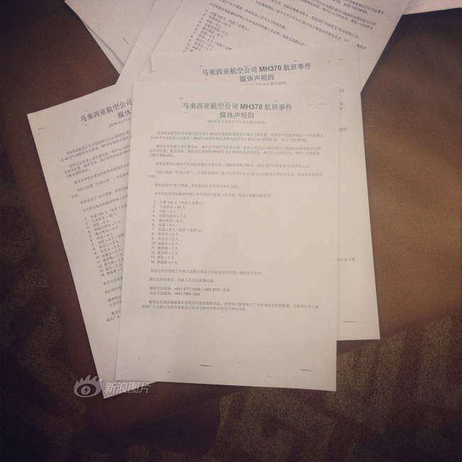 馬航提供的家屬信息登記表和關(guān)于航班事件的媒體聲明。