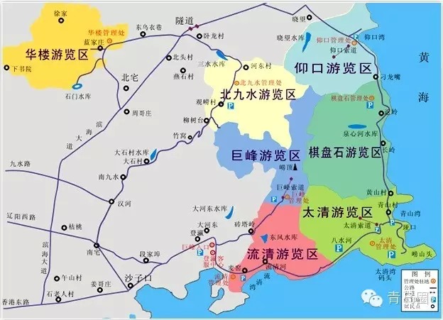 ????從柳樹(shù)臺(tái)至沙子口附近的漢河村為南九水,全程約5公里,山舒水緩,林幽壑美,公路蜿蜒,有時(shí)云隔路斷,人行于云端,俗稱(chēng)十八盤(pán)。農(nóng)舍沿澗依山勢(shì)點(diǎn)散而居,桃、櫻、修竹、山花野草爛漫于峽谷,層層梯田布其間,生機(jī)勃勃。南九水村南峽澗緊湊對(duì)峙,由此進(jìn)入景區(qū)。東有奇峰“紗帽崮”,崮下為觀(guān)川臺(tái),臺(tái)北是盤(pán)山公路及沿澗山村。南有秀峰佇立叫“將軍崮”,澗水由此滾滾出峽。彈月橋穹隆飛架于深澗之上。其北偏西向的山麓古木翳天,松出石隙,相映競(jìng)秀。倚崖面澗有明初建“龍泉觀(guān)”。再上行,巉崖峭立,林木漸密,澗底水響,林中鳥(niǎo)鳴,構(gòu)成美妙的樂(lè)章。有兩條山脈蜿蜒至此相聚,形如二龍戲珠,地名“王子澗”。其上盡是峭壁削崖,公路曲折蜿蜒,稱(chēng)“十八盤(pán)”。終端即“柳樹(shù)臺(tái)”,臺(tái)東豁一口,可登巨峰,北險(xiǎn)深壑,秀峰峽立,谷底即為北九水。