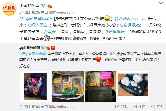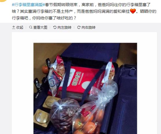 ????年過完了,離家前,爸爸媽媽恨不得將家里能吃的東西都給你帶走!每每打開行李箱總是讓人哭笑不得,其實塞滿行李箱的不是土特產(chǎn),而是爸爸媽媽滿滿的愛和牽掛