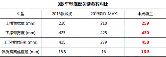 除了動力,底盤也是一輛皮卡相當(dāng)重要的組成部分,即便是汽車門外漢也不可不知。從3款車型的底盤參數(shù)不難看出,中興領(lǐng)主的底盤優(yōu)勢明顯,采用專業(yè)的越野底盤,擁有絕佳的操控性,無論高速還是轉(zhuǎn)向,均能做到響應(yīng)清晰,指向精確;同時最小離地間隙220mm ,坑洼泥濘越野路面輕松應(yīng)對。