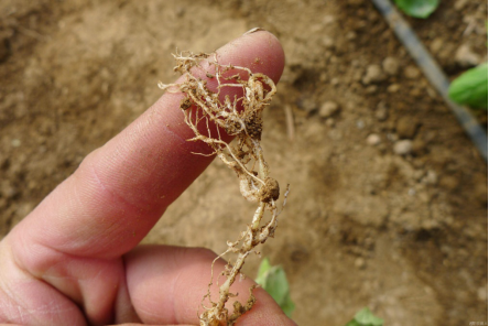 由于根系受到損害,根系活力下降,對營養(yǎng)和水分的吸收、輸送變差,根部生長受阻而常出現(xiàn)不長新根的現(xiàn)象。另外在根結(jié)線蟲危害嚴(yán)重時,根腐病、枯萎病等病菌與線蟲共同危害,造成爛根、根腐,進(jìn)而影響病株的生長。一般來說,病株在受害初期癥狀不明顯,長不快、矮小、果實(shí)小且少,與缺水缺肥癥狀相似。在受害中后期,植株早衰退化、萎蔫,甚至是枯萎而死。