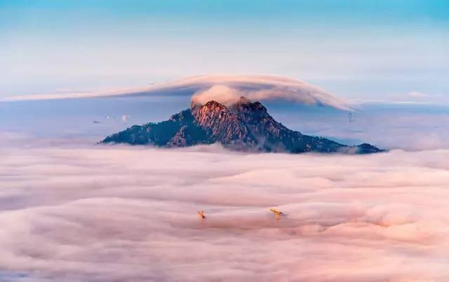 (浮山與平流霧,浮山上方的云霧有如從“火山”中噴發(fā)而出;攝影師@徐堃)