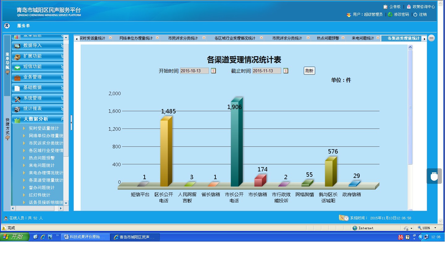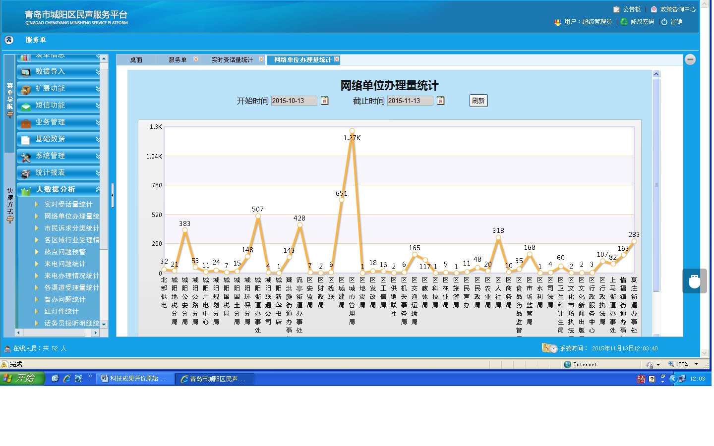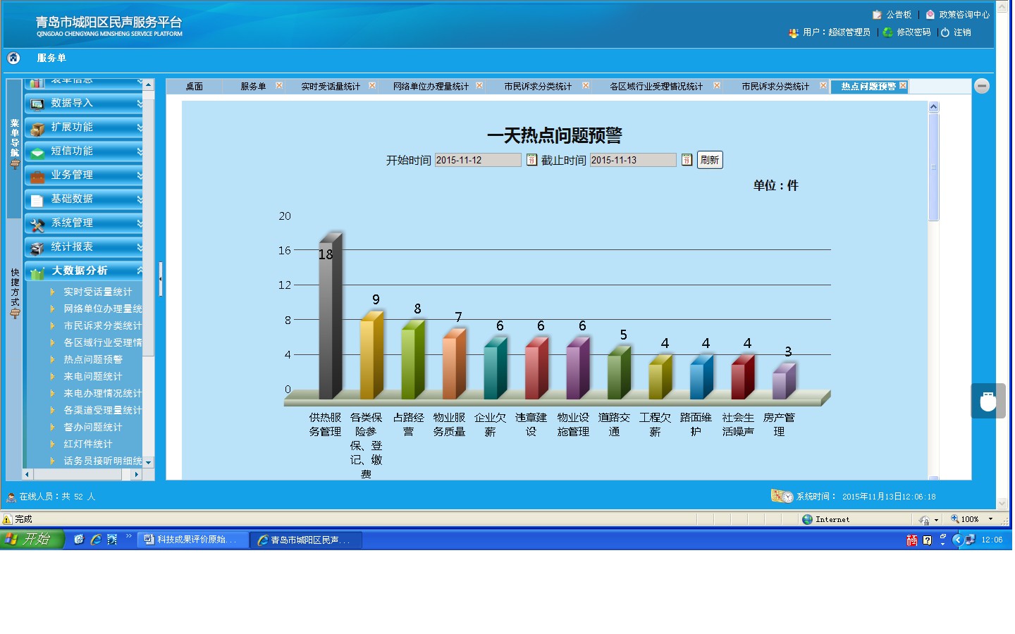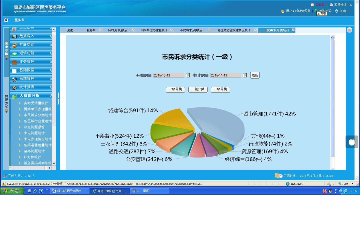④實(shí)現(xiàn)公眾訴求數(shù)據(jù)信息分析和應(yīng)用。建立了14個(gè)數(shù)據(jù)分析模塊和12個(gè)統(tǒng)計(jì)報(bào)表模塊 ,可以實(shí)現(xiàn)市民訴求信息實(shí)時(shí)分析、規(guī)律研判、分類處置,及時(shí)形成民聲專報(bào),為政府決策和部門履職提供數(shù)據(jù)支撐。