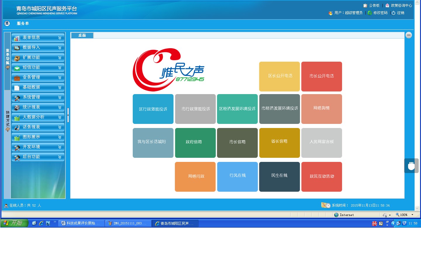 青島市城陽(yáng)區(qū)民聲服務(wù)辦公室在本次2017智慧青島典型案例評(píng)選活動(dòng)中申報(bào)了“青島市旅游公共服務(wù)系統(tǒng)”案例。據(jù)了解,青島市城陽(yáng)區(qū)民聲服務(wù)平臺(tái)是接處包括公開(kāi)電話、網(wǎng)上信箱、網(wǎng)絡(luò)輿情和政民互動(dòng)等4大類20條市民訴求渠道的綜合服務(wù)平臺(tái),該平臺(tái)充分利用“互聯(lián)網(wǎng)+信息化”領(lǐng)先技術(shù),采用Java或.NET語(yǔ)言進(jìn)行了全新開(kāi)發(fā),適用于金宏網(wǎng)和互聯(lián)網(wǎng)環(huán)境,可以有效實(shí)現(xiàn)對(duì)社情民意數(shù)據(jù)信息分析和共享利用。突出民聲服務(wù)大數(shù)據(jù)分析功能,創(chuàng)新加入了特定組織和行業(yè)管理的業(yè)務(wù)功能,整個(gè)平臺(tái)建設(shè)水平位居全國(guó)同行業(yè)的前列。