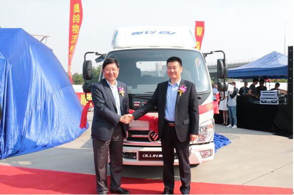 【中國(guó)物流與采購(gòu)聯(lián)合會(huì)副會(huì)長(zhǎng)蔡進(jìn)先生與福田輕型商用車事業(yè)本部奧鈴業(yè)務(wù)總監(jiān)王建軍先生為福田奧鈴EV純電動(dòng)輕卡揭幕】