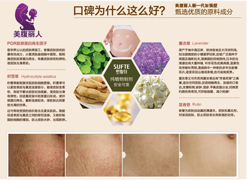 美腹麗人從問世到如今以其對健康、科學的堅持,一直嚴格按秘密配方中要求的純天然成分,對消費者的身體健康無任何副作用。美腹麗人獨有的EGF生長因子是從火蜥蜴血液中提取,具有促進表皮細胞和真皮細胞再生長,可使受損的皮膚表面修復,能激活多種生化酶,促進細胞DNA、RNA、羥脯氨酸的合成,促進病變肌膚的修復。能有效祛除肥胖紋的產品美腹麗人能使受損和斷裂的真皮彈性纖維更新、修復、起到平復肥胖紋,消除疤痕,吸收皮膚褶皺,緊致皮膚的效果!