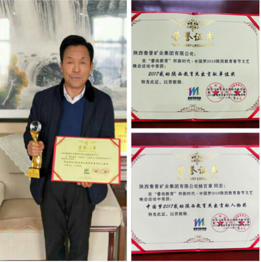 2018年剛剛來(lái)臨,楊百章就再一次登上榮譽(yù)的獎(jiǎng)臺(tái),2018年1月27日,楊百章在西安榮獲“中國(guó)夢(mèng)2017感動(dòng)陜西教育杰出貢獻(xiàn)人物獎(jiǎng)”,陜西秦晉礦業(yè)集團(tuán)有限公司榮獲“2017感動(dòng)陜西教育杰出貢獻(xiàn)單位獎(jiǎng)”。作為本屆晚會(huì)最具分量的嘉賓之一,楊百章因德高望重,被大會(huì)組委會(huì)隆重推舉為指定頒獎(jiǎng)嘉賓,三次為獲獎(jiǎng)企業(yè)及優(yōu)秀個(gè)人頒獎(jiǎng)!成為當(dāng)天晚會(huì)所有企業(yè)及個(gè)人學(xué)習(xí)的榜樣,彰顯了一流企業(yè)家的風(fēng)采。