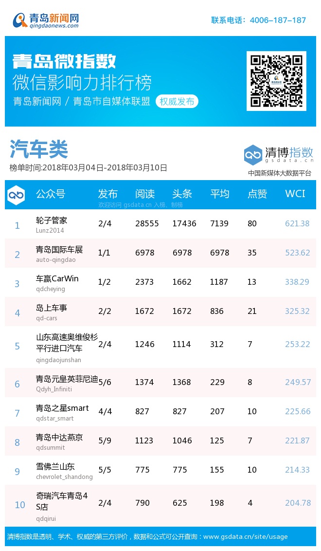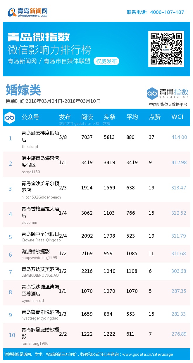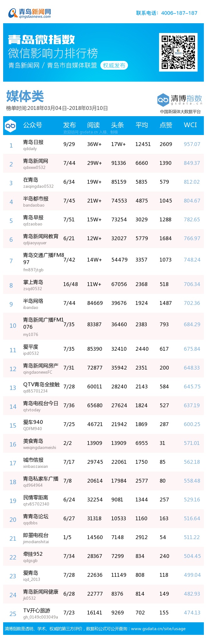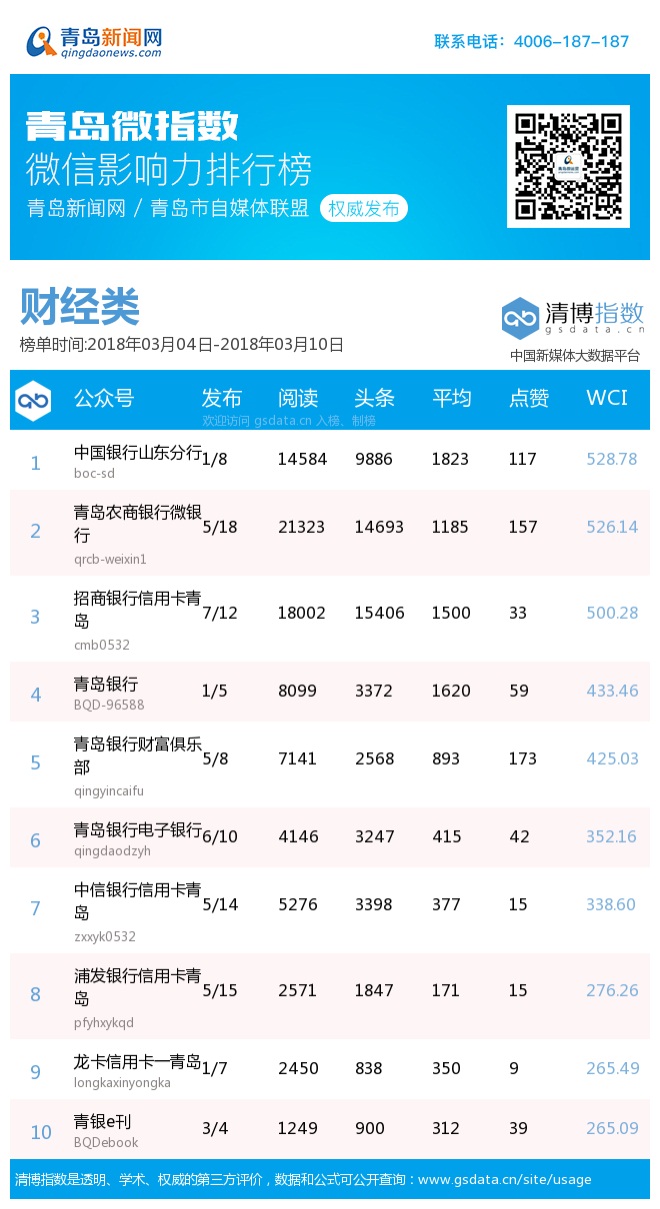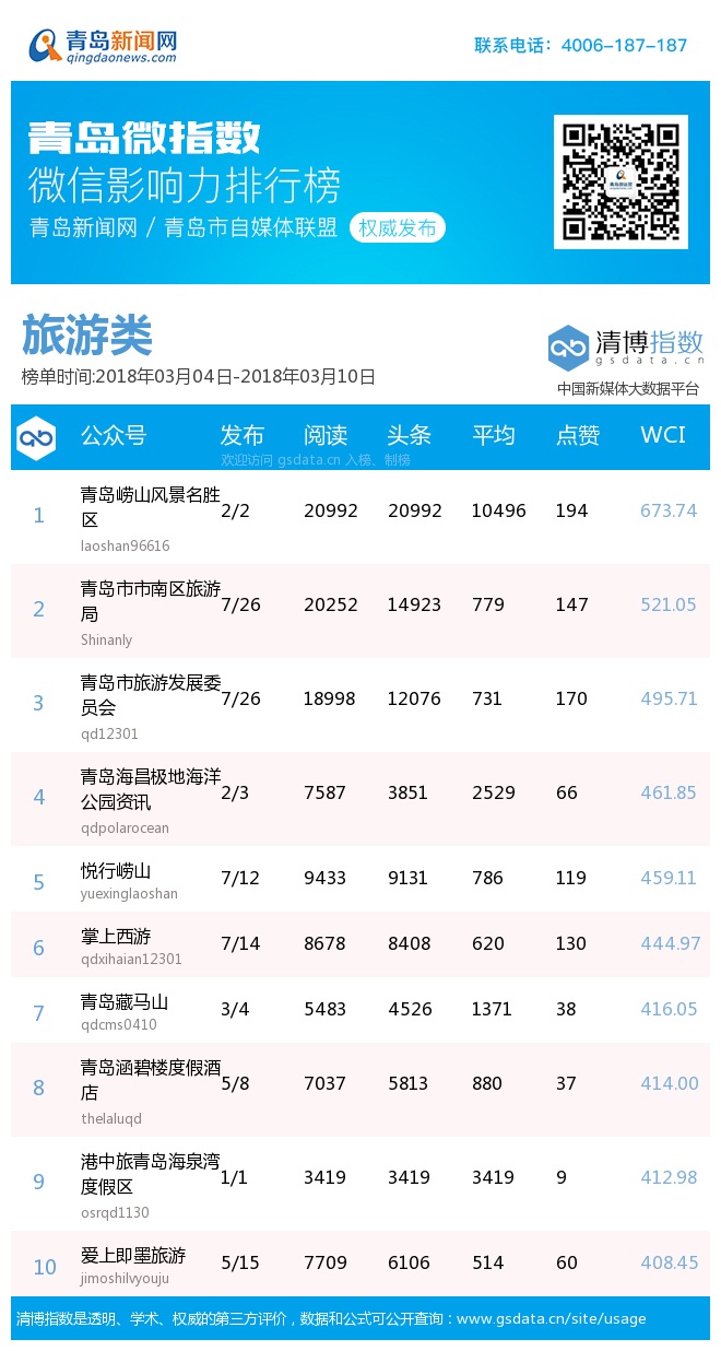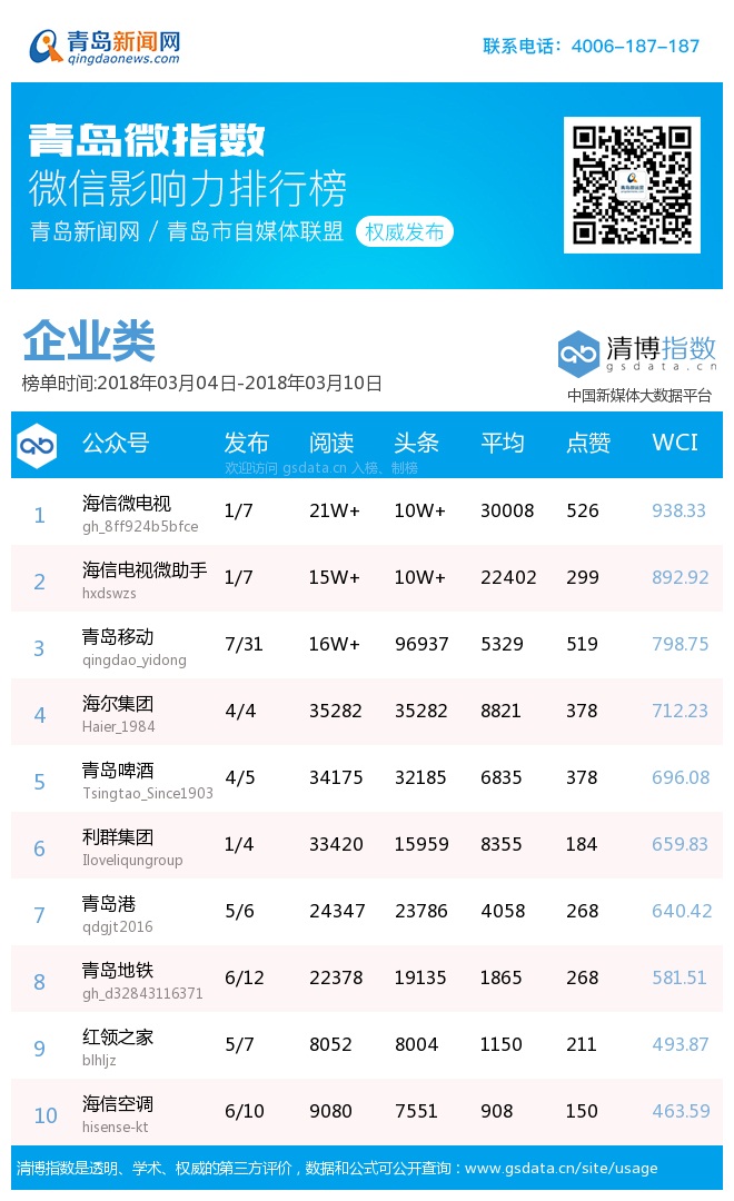 3、本次榜單收錄了青島14個行業(yè)微信公眾號,如您的賬號暫未收錄,可聯(lián)系4006-187-187。
