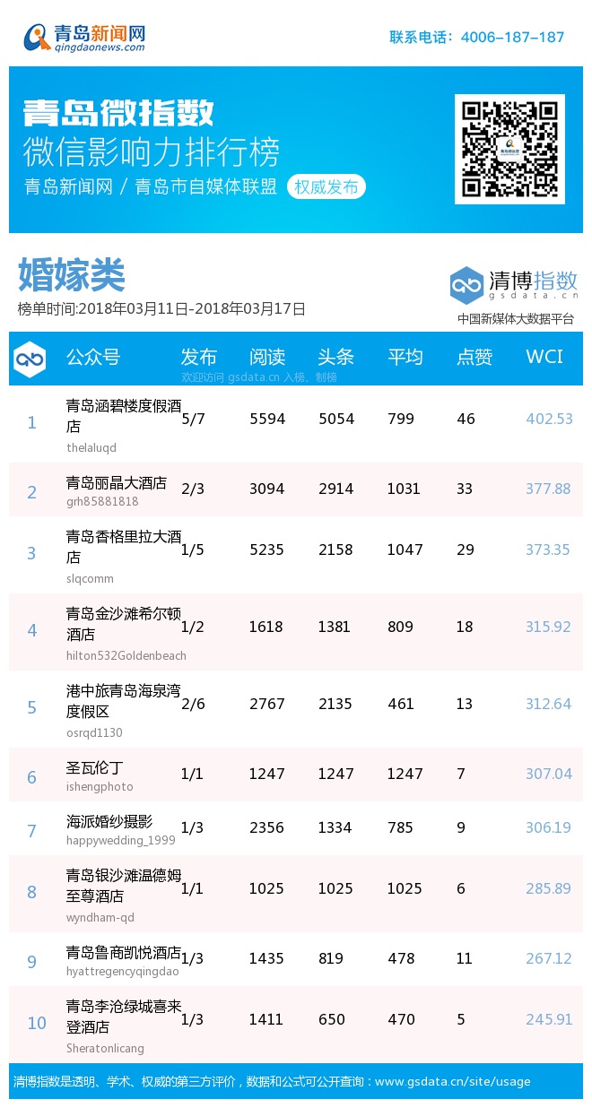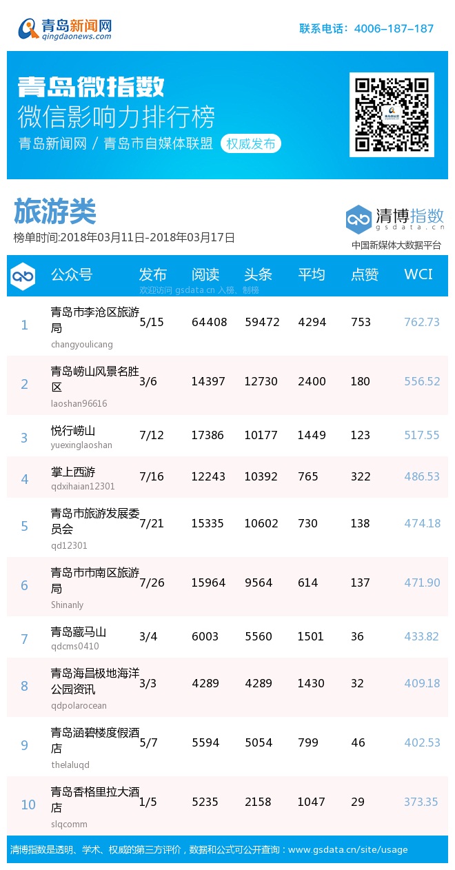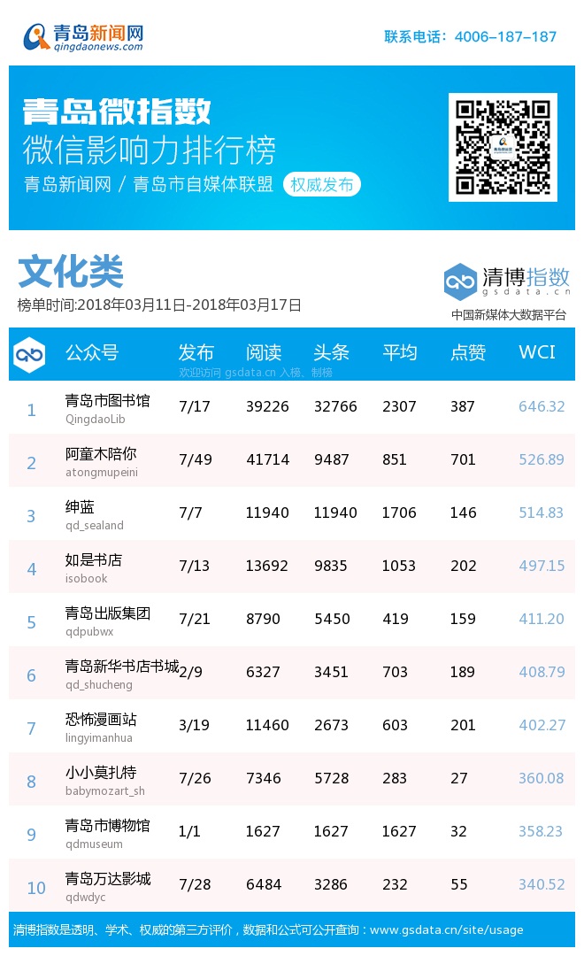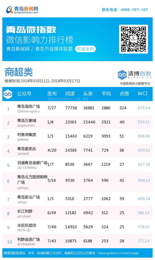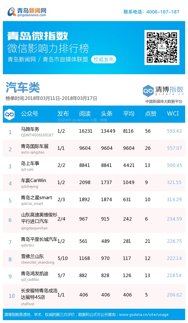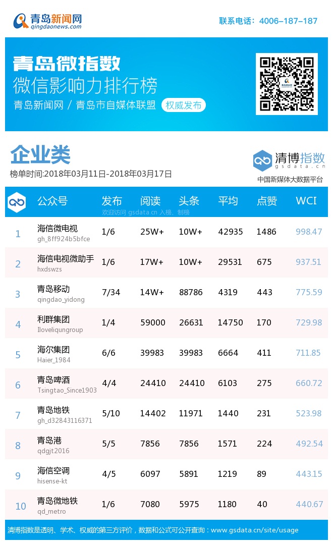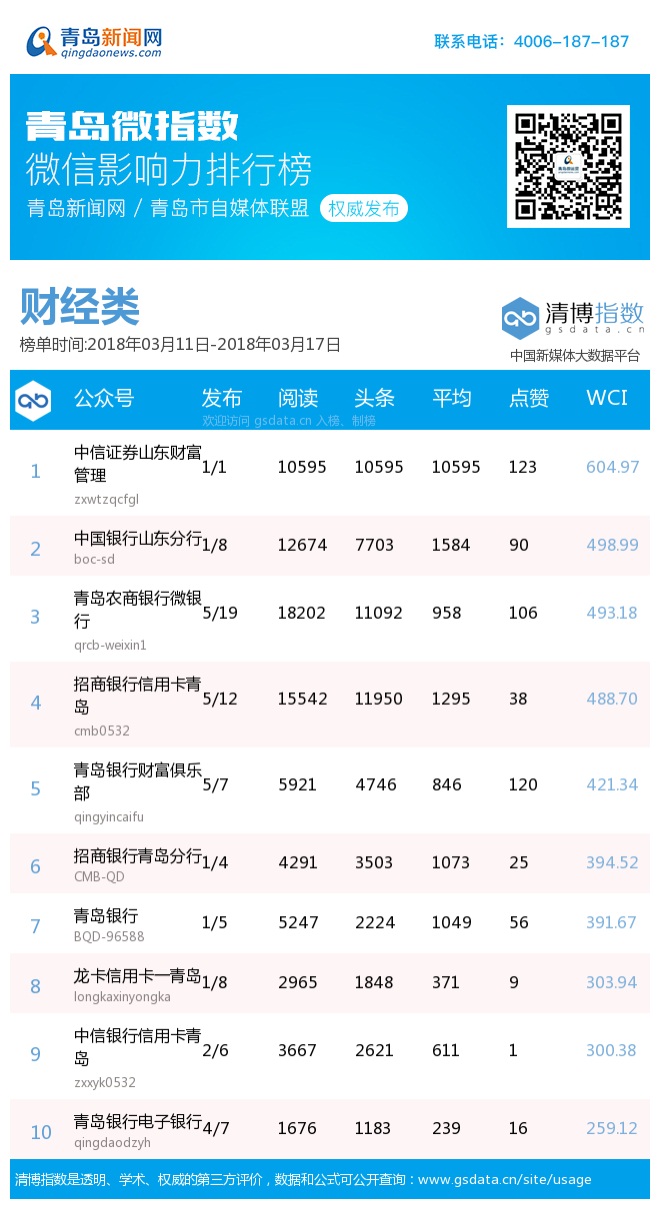 3、本次榜單收錄了青島14個行業(yè)微信公眾號,如您的賬號暫未收錄,可聯(lián)系4006-187-187。