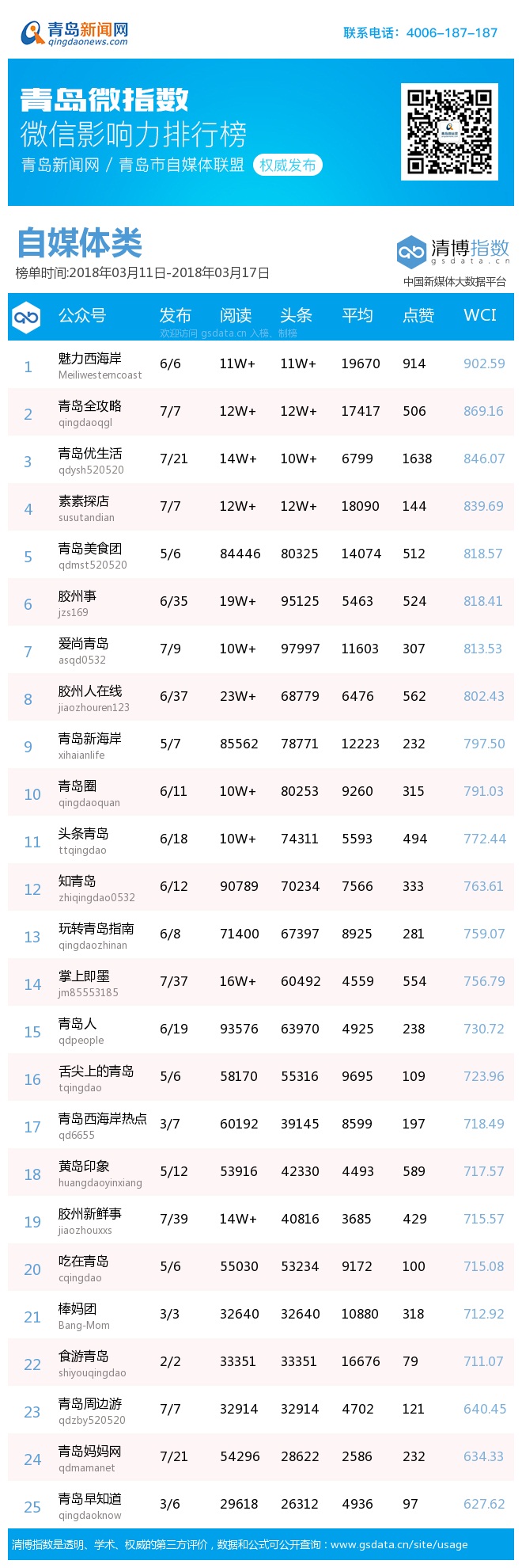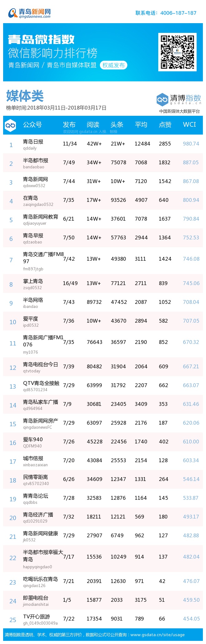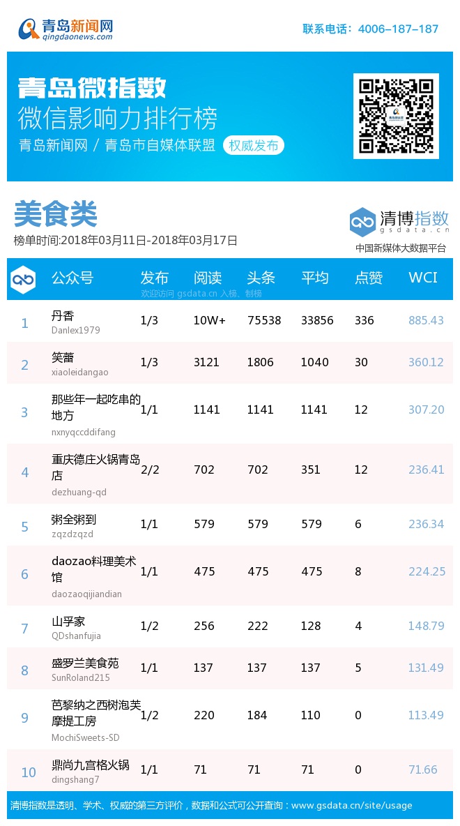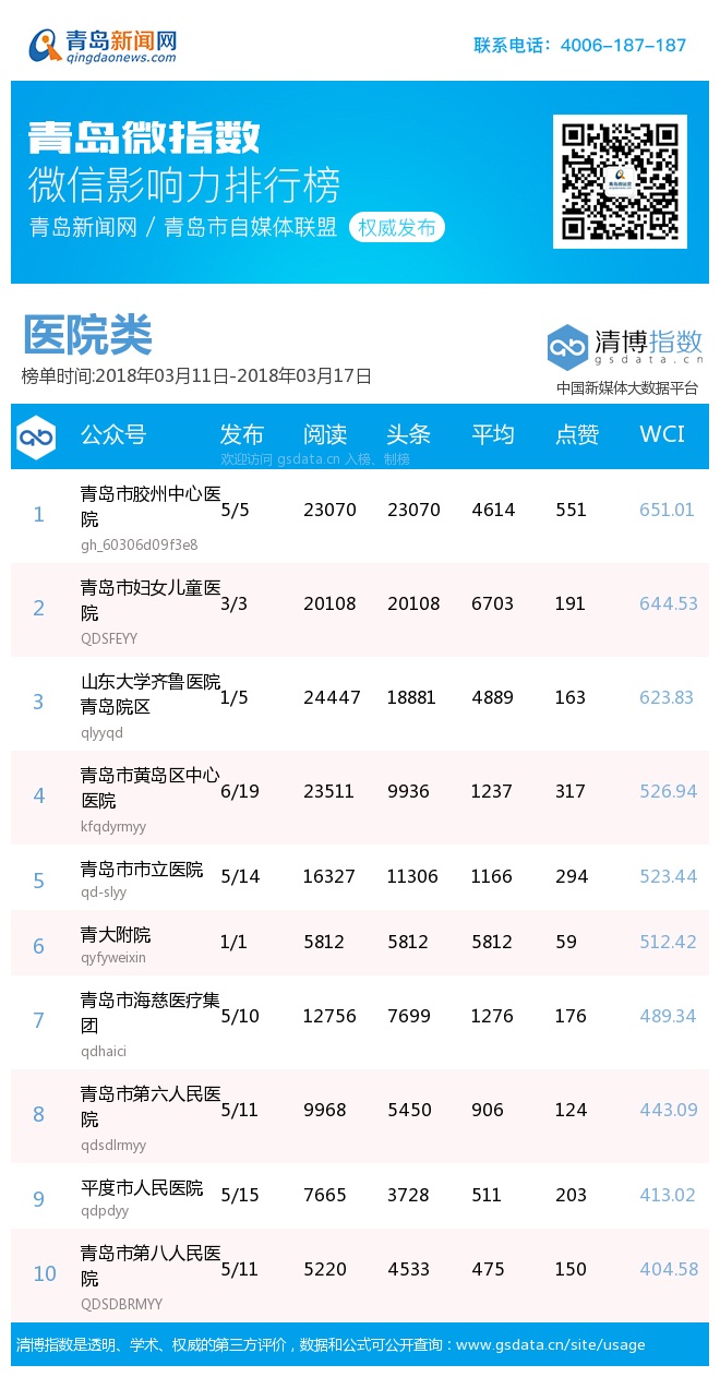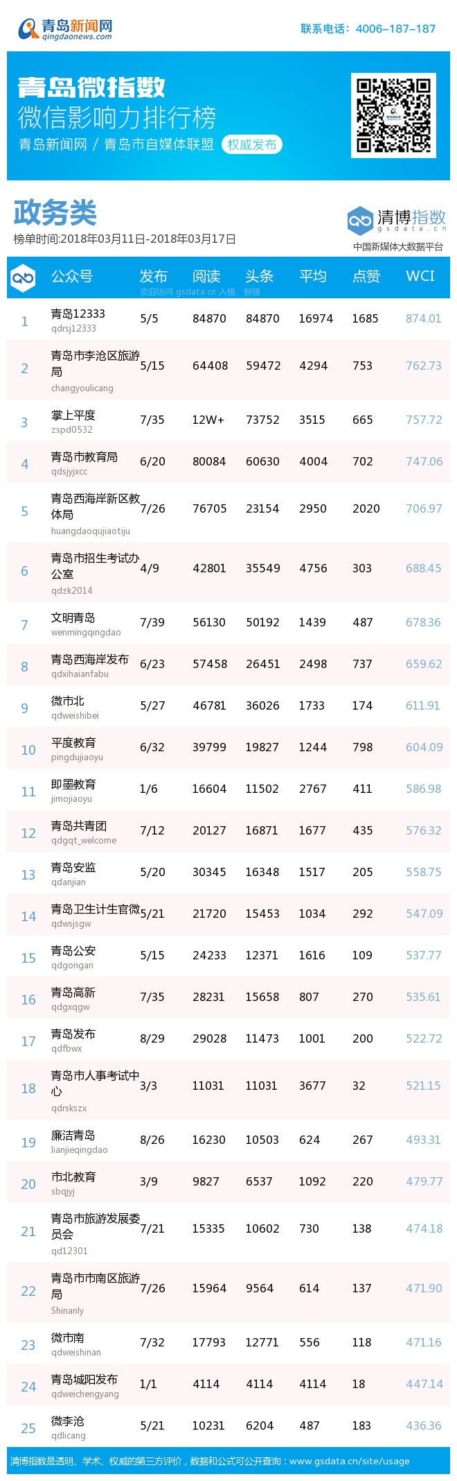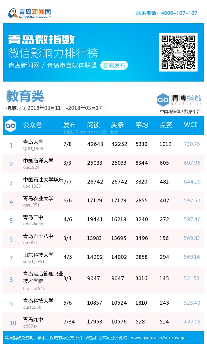 3、本次榜單收錄了青島14個行業(yè)微信公眾號,如您的賬號暫未收錄,可聯(lián)系4006-187-187。