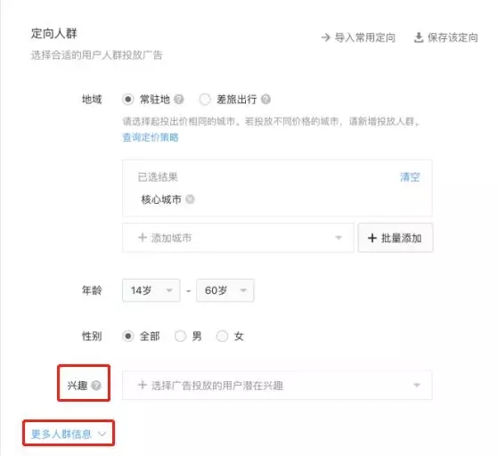 最最最重要的是“興趣”一項,提供24個一級興趣標簽,183個二級標簽供選擇,并且官方會根據(jù)近三個月用戶的社交軌跡(如公眾號訂閱類型)和行為表現(xiàn)(如文章閱讀類型)幫你選擇潛在用戶。在小程序上投放廣告更精準、更有效、效果更好。