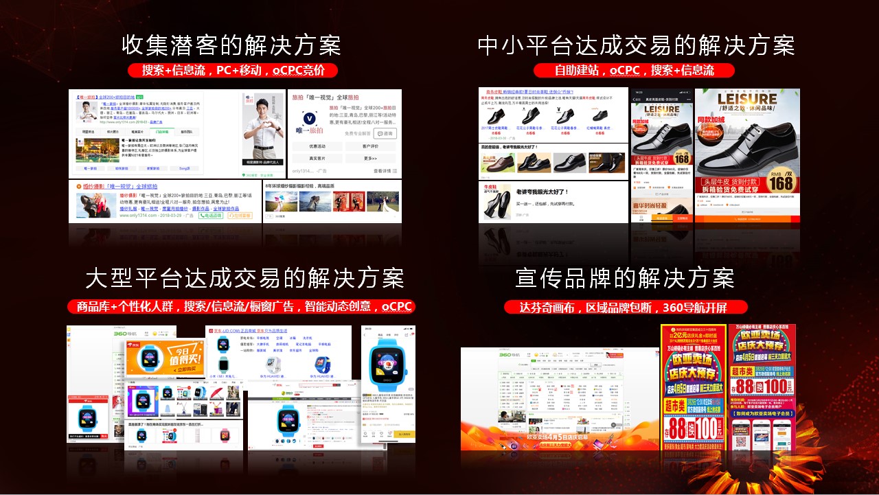 助力中小企業(yè)發(fā)展,營銷需要找到人更要找對人想要推廣,第一步就要找到人。PC+移動的融合時代,用戶是分散的,他們休閑旅游,居家生活,外出辦公,喜歡看新聞,看電影,玩游戲…不同的生活場景,不同的用戶聚集地。如何找到他們呢?需要覆蓋不同生活場景的多樣產(chǎn)品,無論用戶辦公還是休閑,瀏覽網(wǎng)站還是使用手機,都能有效地將企業(yè)信息推送至用戶眼前。這些,360可以做到,這也是企業(yè)被用戶認(rèn)知的第一步。目前,360已經(jīng)幫助游戲、裝修服務(wù)、出國移民等300+行業(yè)廣告主找到潛在客戶。