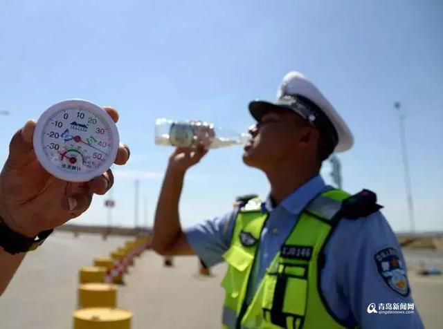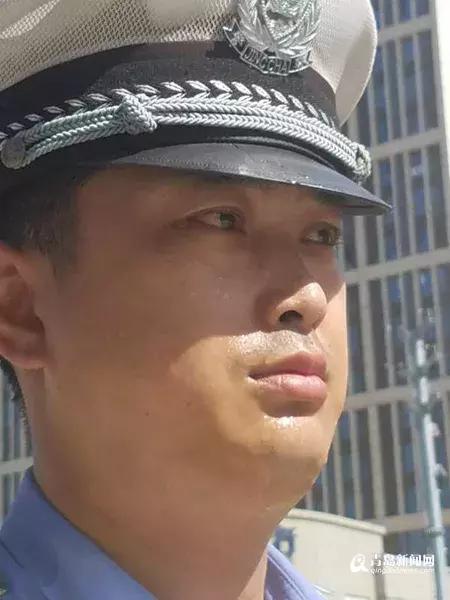 即墨交警大隊一位民警在戶外執(zhí)勤,汗水順著臉頰不斷向下淌。