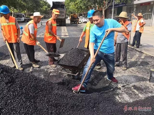 瀝青出廠的時候溫度有165°C,運至現(xiàn)場時約一百三四十度,為了道路的暢通,工人們冒著烘烤高溫以最快的速度卸車、鋪裝。