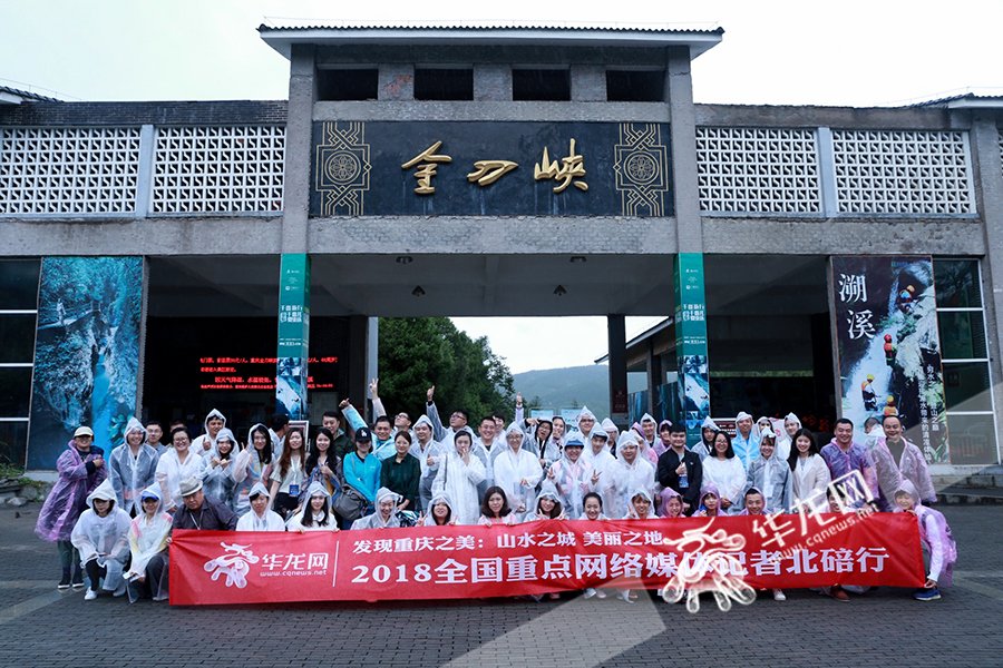 網(wǎng)媒行的記者正在金刀峽景區(qū)門(mén)口合影。記者 謝鵬 攝