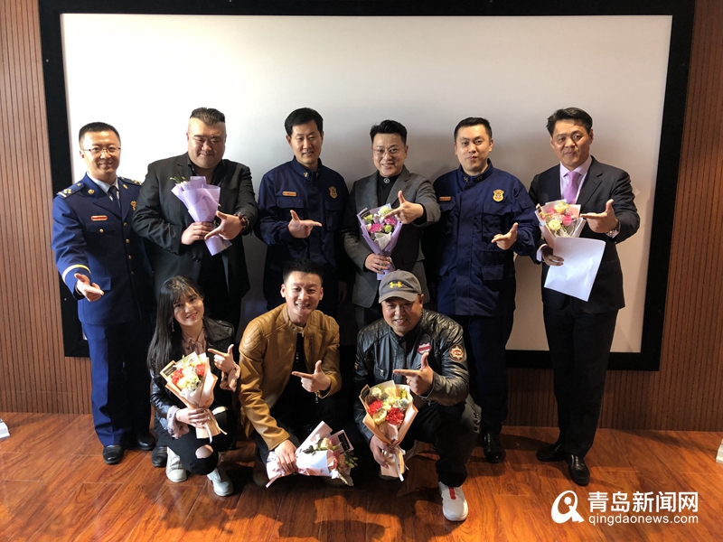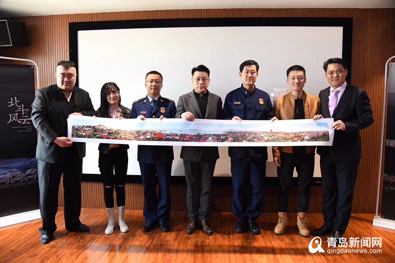 劇組向消防官兵贈(zèng)送青島全景圖。