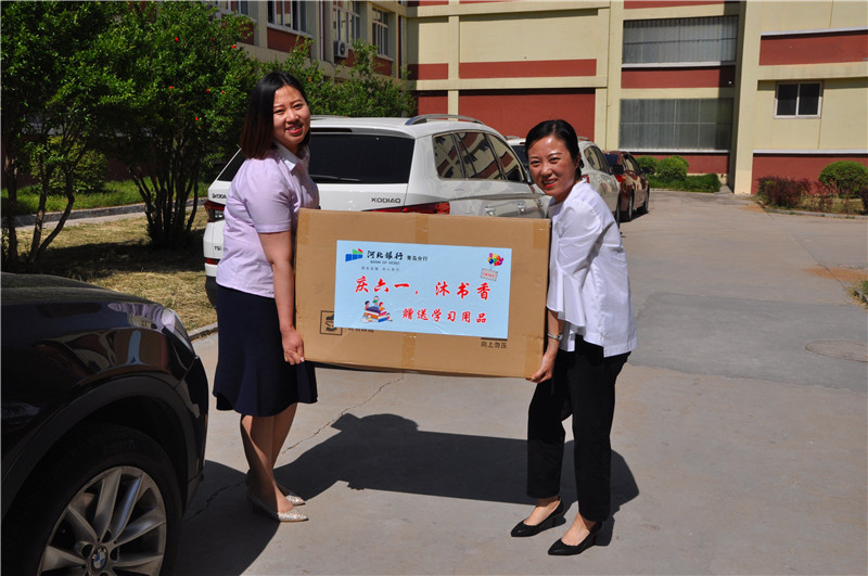 河北銀行青島分行副行長(zhǎng)聶雙雙(右)為膠州張應(yīng)小學(xué)的孩子贈(zèng)送學(xué)習(xí)用品