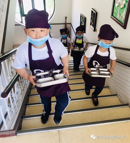 陣容強(qiáng)大的保育阿姨要幫小朋友送餐具啦~原來(lái)阿姨每天都要拿這么重的餐具和飯菜呀,真辛苦!