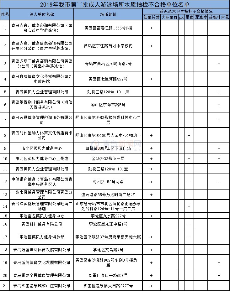 青島新聞網(wǎng)7月29日訊 (記者 張萍)今天,青島市衛(wèi)生健康委監(jiān)督執(zhí)法局公布我市第二批成人游泳場所水質(zhì)抽檢結(jié)果,全市共抽檢成人游泳場所103家,檢測結(jié)果顯示,其中有21家成人游泳場所的水質(zhì)不符合國家衛(wèi)生標準。市衛(wèi)生健康委監(jiān)督執(zhí)法局公示了不合格場所名單,其中海信天悅游泳池、中健銀座健身中央商務(wù)區(qū)店等上榜。