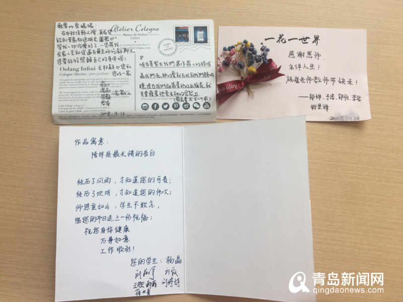 “這都是學(xué)生們送我的教師節(jié)禮物。那幾只靠枕是學(xué)生親手繡的?!贝拗衩沸σ庥馗嬖V記者,隨手翻出了學(xué)生的祝福賀卡和短信。