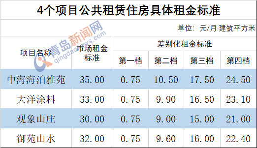 4個公共租賃住房項(xiàng)目租金標(biāo)準(zhǔn)具體見下表: