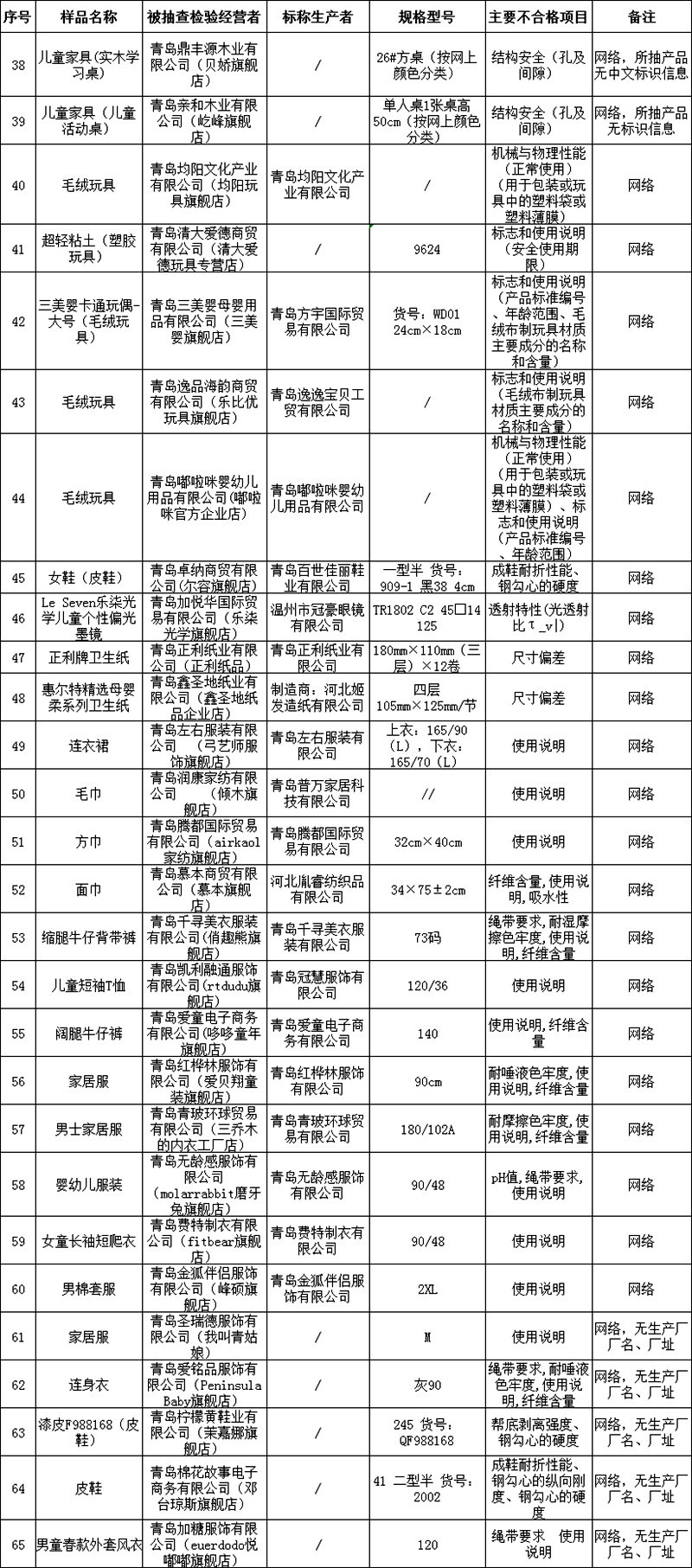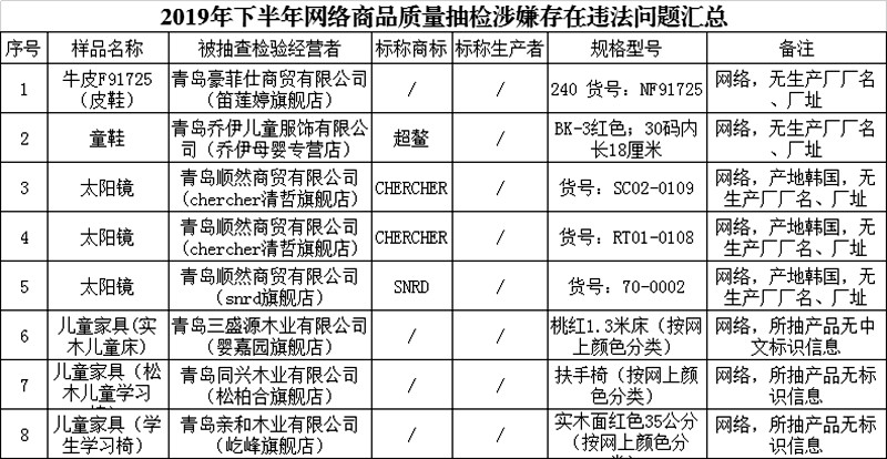 青島新聞網(wǎng)12月25日訊(記者 黃曉)青島市市場(chǎng)監(jiān)督管理局公示了2019年下半年流通領(lǐng)域商品質(zhì)量監(jiān)督抽查結(jié)果,本次共抽檢了153家經(jīng)營(yíng)者的30類285批次商品,其中212批次合格,有65批次不合格,在網(wǎng)絡(luò)抽檢中有8批次商品涉嫌存在違法問(wèn)題。不合格商品涉及服裝、皮鞋、文具、兒童玩具、兒童家具、衛(wèi)生紙、毛巾、床上用品、電線電纜等多個(gè)品類。