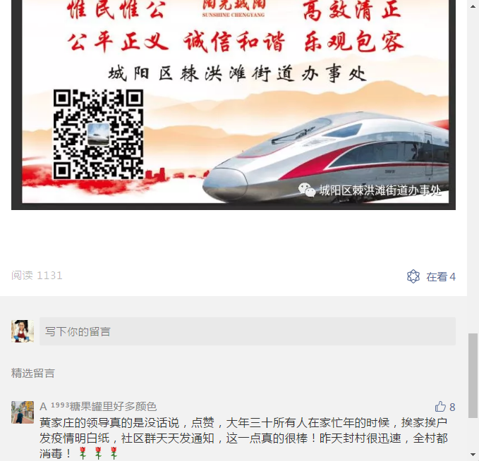 青島新聞網(wǎng)1月30日訊(通訊員 張美琴)在“城陽區(qū)棘洪灘街道辦事處”公眾號1月27日發(fā)布一篇文章下方,出現(xiàn)了這樣一條評論“黃家莊社區(qū)的領(lǐng)導(dǎo)真的沒話說,點(diǎn)贊,大年三十所有人在家忙年的時候,挨家挨戶發(fā)疫情明白紙,社區(qū)群里天天發(fā)通知,這一點(diǎn)真的很棒!昨天封村很迅速,全村都消毒!”短短幾句話,讓奮斗在疫情防控狙擊戰(zhàn)一線的工作者們內(nèi)心既溫暖又感動。
