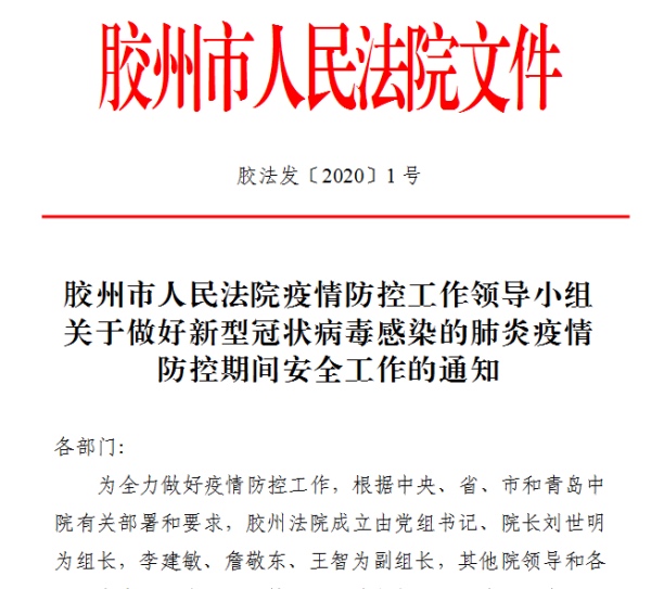 一是成立工作專班。面對新型冠狀病毒疫情,膠州法院高度重視、堅定信心,精心組織、緊急行動,于1月26日成立由黨組書記、院長劉世明任組長的疫情防控領導小組。