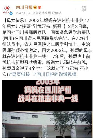 17年前,“非典”發(fā)生時(shí),孫穎姐姐的媽媽?xiě)?zhàn)斗在抗擊非典一線,17年后,她作為四川醫(yī)療隊(duì)的一員,到達(dá)武漢疫情前線,抗擊新型冠狀病毒。
