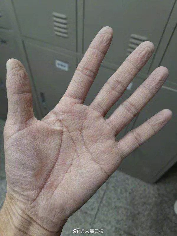 有些由于長(zhǎng)時(shí)間穿戴口罩、隔離服,臉上出現(xiàn)了口罩的印痕跡、手被泡得沒(méi)了紋路……