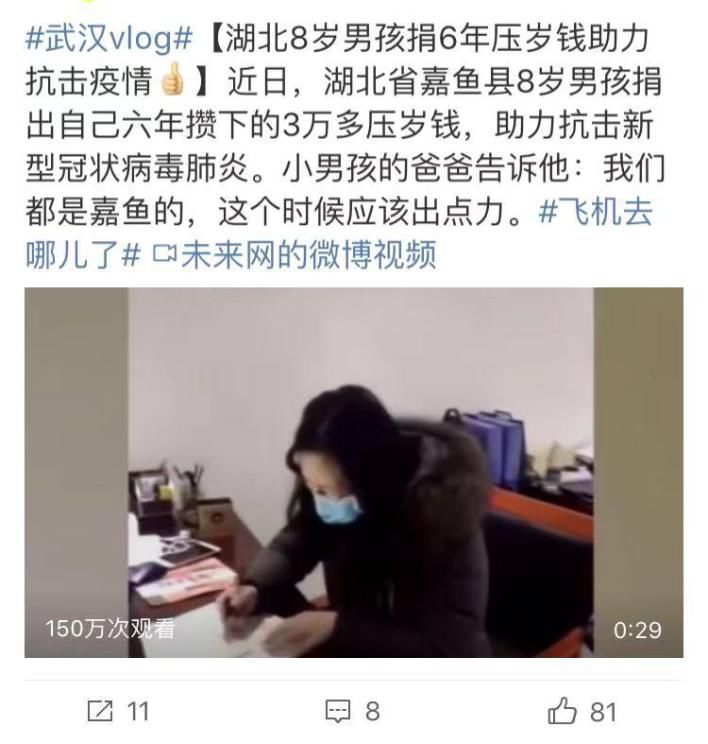 在湖北周邊的嘉魚(yú)縣,有個(gè)8歲的男孩,在爸爸的帶領(lǐng)下,將自己攢了6年的壓歲錢(qián)捐出來(lái),助力抗擊病毒。