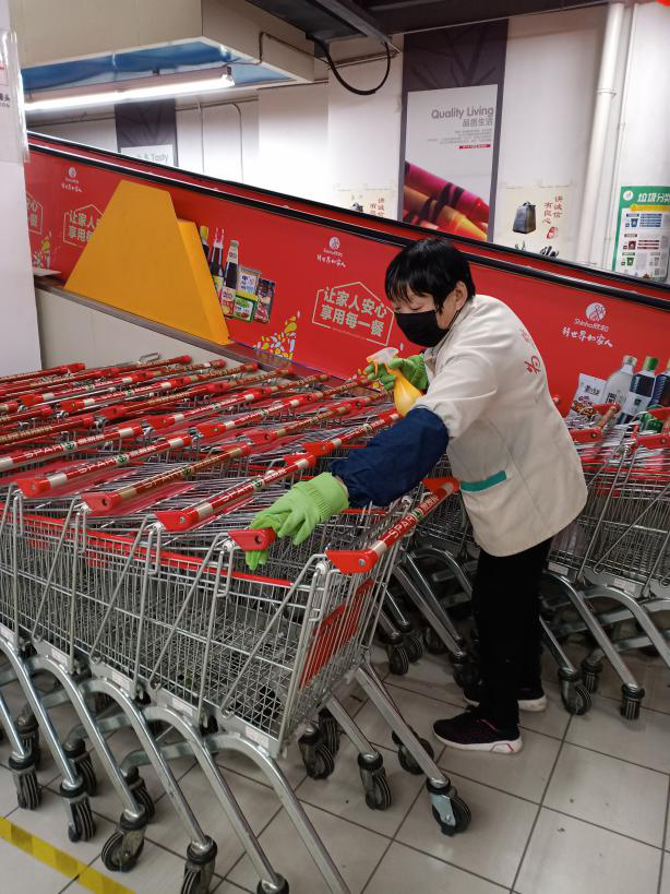 街道大型超市入口設(shè)置防疫檢查崗,配齊測(cè)溫儀、登記表、消毒液等設(shè)施,安排專職工作人員,對(duì)進(jìn)入超市顧客進(jìn)行測(cè)溫、消毒,對(duì)未佩戴口罩的顧客進(jìn)行提醒和勸返,體溫超過(guò)37度的及時(shí)按照程序采取相應(yīng)措施,從源頭上防止病毒傳播。超市堅(jiān)持“專人負(fù)責(zé),全員參與”的工作思路,對(duì)超市收銀臺(tái)、電梯間、門把手等各個(gè)角落進(jìn)行不定時(shí)循環(huán)消殺,定時(shí)做好超市內(nèi)部區(qū)域通風(fēng)換氣,保證室內(nèi)空氣清新。