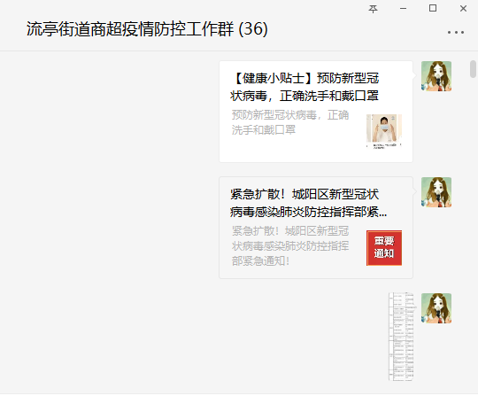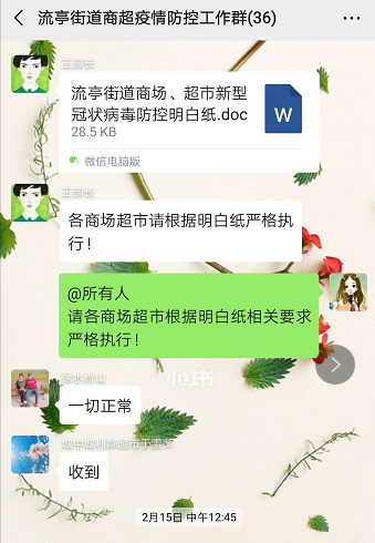 在疫情出現(xiàn)的第一時(shí)間,街道商務(wù)商貿(mào)科就建立了“流亭街道商超疫情防控工作群”,全面摸排商場(chǎng)超市的外來(lái)返青人員,加強(qiáng)人員管理并及時(shí)上報(bào)。同時(shí),將正確佩戴口罩、正確洗手、正確消殺等健康小知識(shí)和知識(shí)手冊(cè)在微信群里進(jìn)行宣傳,提高商場(chǎng)、超市的防控意識(shí)。
