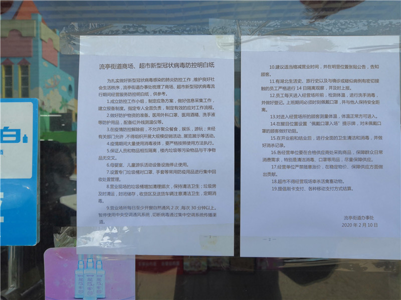 前期,流亭街道根據(jù)商場(chǎng)、超市的實(shí)際經(jīng)營(yíng)情況,對(duì)經(jīng)營(yíng)場(chǎng)所消殺、顧客出入、員工管理等方面嚴(yán)格要求,發(fā)放了《流亭街道商場(chǎng)、超市新型冠狀病毒防控明白紙》,制定了《流亭街道商場(chǎng)、超市繼續(xù)經(jīng)營(yíng)工作方案》。