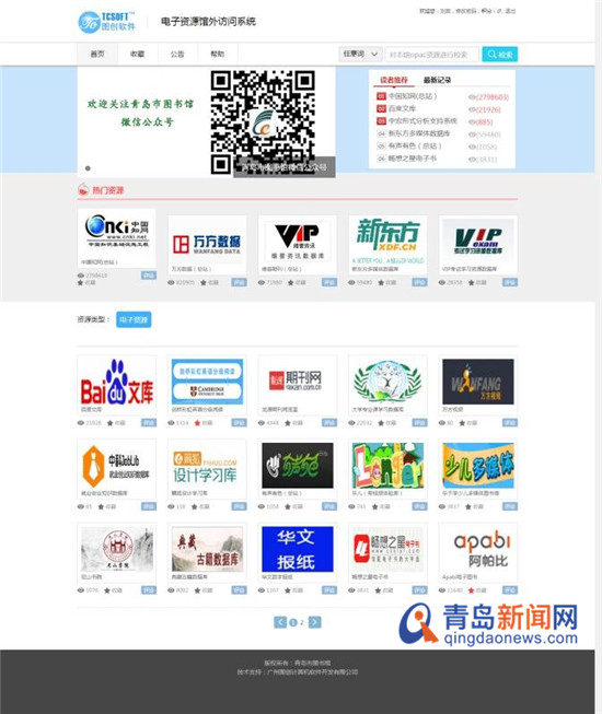 目前,青島市圖書館數(shù)字圖書館數(shù)字資源包括1億2000萬篇論文、130余萬份免費電子圖書、視頻、有聲讀物等,可訪問資源總量在350TB以上,有PC和移動端兩種訪問方式,具有資源量大、內容豐富、使用方便等特點。疫情防控期間,市民和讀者可以通過訪問青島市圖書館官方網(wǎng)站,點擊首頁右上角的“訪問數(shù)字資源”按鈕登錄數(shù)字圖書館;還可以通過關注青島市圖書館微信公眾號,進入“青圖悅讀”欄目的方式進行數(shù)字資源訪問,從而實現(xiàn)在家享受海量數(shù)字資源的便捷服務。