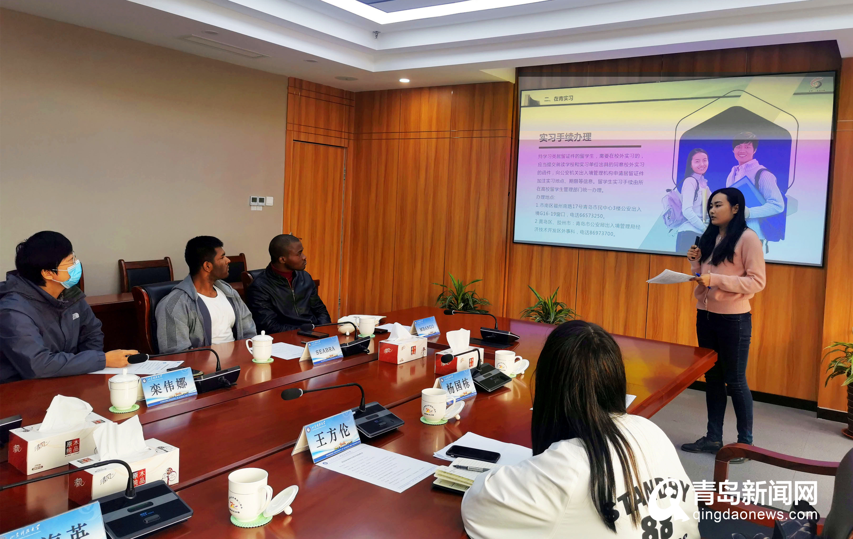 在中國石油大學(xué)(華東)活動現(xiàn)場,參會人員研討了簡化外國留學(xué)生簽證手續(xù)、組織外國留學(xué)生實(shí)習(xí)、推進(jìn)外國留學(xué)生在“兩區(qū)”就業(yè)創(chuàng)業(yè)等議題。座談會后,青島市人力資源社會保障局以“外國留學(xué)生就業(yè)創(chuàng)業(yè)政策解讀”為題,用英文面向外國留學(xué)生開展政策宣講,宣講內(nèi)容包括“青島概況、在青實(shí)習(xí)、在青就業(yè)、優(yōu)惠政策”等方面,引起現(xiàn)場外國留學(xué)生的熱烈反響。外國留學(xué)生們紛紛提出畢業(yè)后來青工作許可、入境簽證、求職應(yīng)聘等問題,現(xiàn)場得到各部門的詳細(xì)解答。