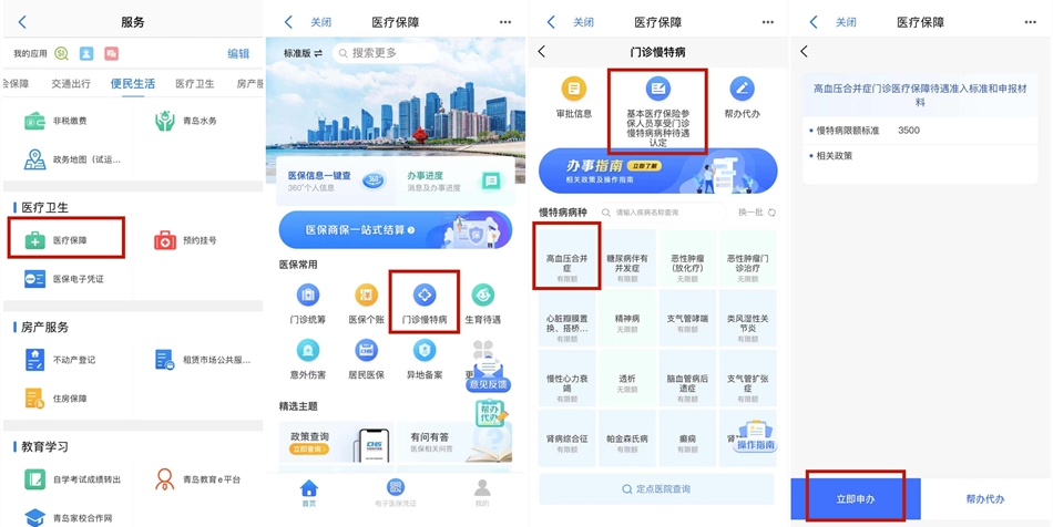 為方便家有慢性病、慢特病病人群體及家屬辦事,除到醫(yī)保工作站、定點醫(yī)院或醫(yī)保經(jīng)辦機(jī)構(gòu)辦理等門診慢特病辦理方式外,“愛山東?青e辦”APP接入了青島醫(yī)保門診慢特病掌上辦理新渠道,參保人可以使用“愛山東?青e辦”APP,足不出戶辦好門診慢特病待遇掌上申辦,讓病人及家屬“少跑腿”。首先在“愛山東?青e辦”APP首頁的頂部搜索欄搜索“醫(yī)療保障”應(yīng)用或在首頁“服務(wù)”詳情頁的“醫(yī)療衛(wèi)生”分類下找到“醫(yī)療保障”;然后,在應(yīng)用詳情頁的“門診慢特病”分類下,找到“基本醫(yī)療保險參保人員享受門診慢特病病種待遇認(rèn)定”,點擊進(jìn)行待遇認(rèn)定申請并按提示如實填寫并上傳申辦材料,點擊“提交”即可。提交完成后,查詢審核結(jié)果可點擊“審批信息”按時間段搜索審批結(jié)果。除此之外申辦人可通過“門診慢特病辦理進(jìn)度查詢”,隨時查詢辦理進(jìn)度。