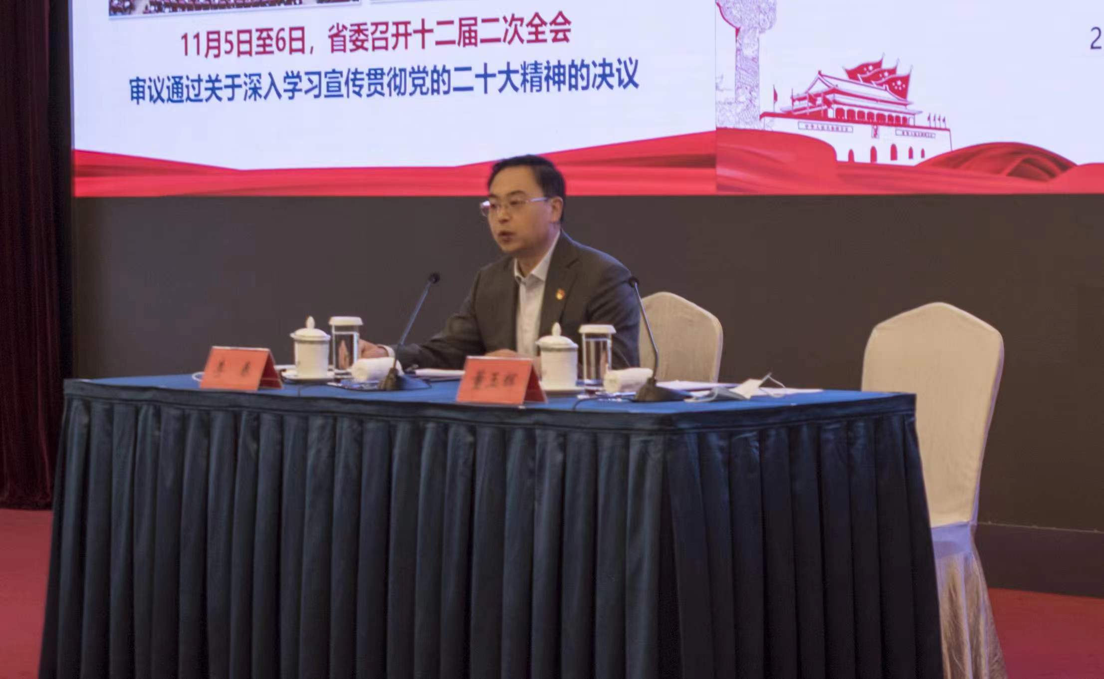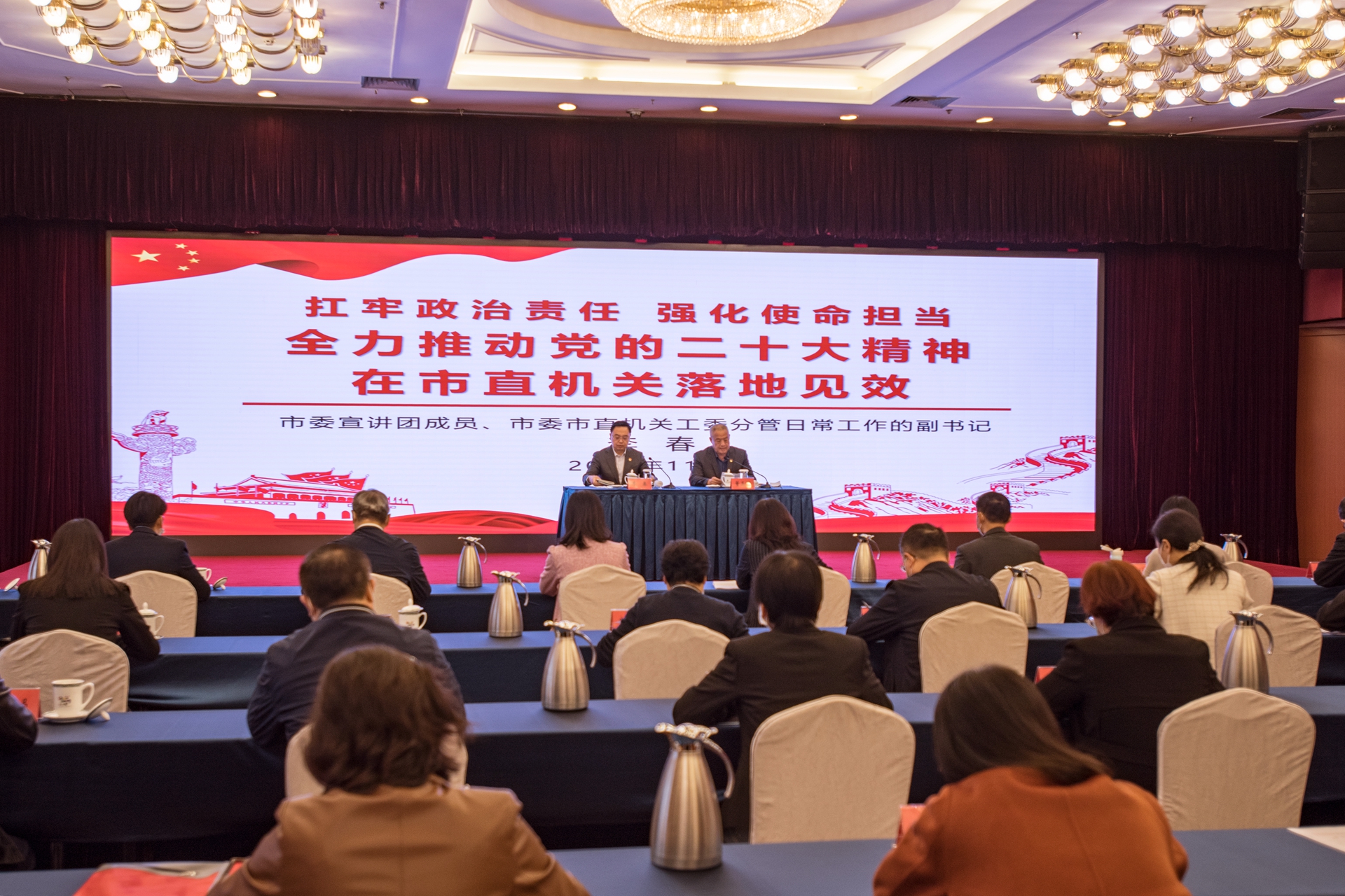 青島新聞網(wǎng)11月21日訊 11月17日上午,市直機(jī)關(guān)學(xué)習(xí)貫徹黨的二十大精神宣講報(bào)告會(huì)在市級(jí)機(jī)關(guān)會(huì)議中心一樓會(huì)議廳舉行。市委宣講團(tuán)成員、市委市直機(jī)關(guān)工委分管日常工作的副書(shū)記李春同志作報(bào)告。報(bào)告會(huì)同時(shí)對(duì)市直機(jī)關(guān)廣泛深入開(kāi)展黨的二十大精神宣講工作進(jìn)行了再動(dòng)員、再部署。市直機(jī)關(guān)黨組織專職副書(shū)記代表,工委機(jī)關(guān)黨員干部代表等50人參加報(bào)告會(huì)。