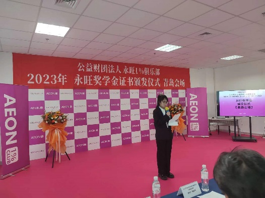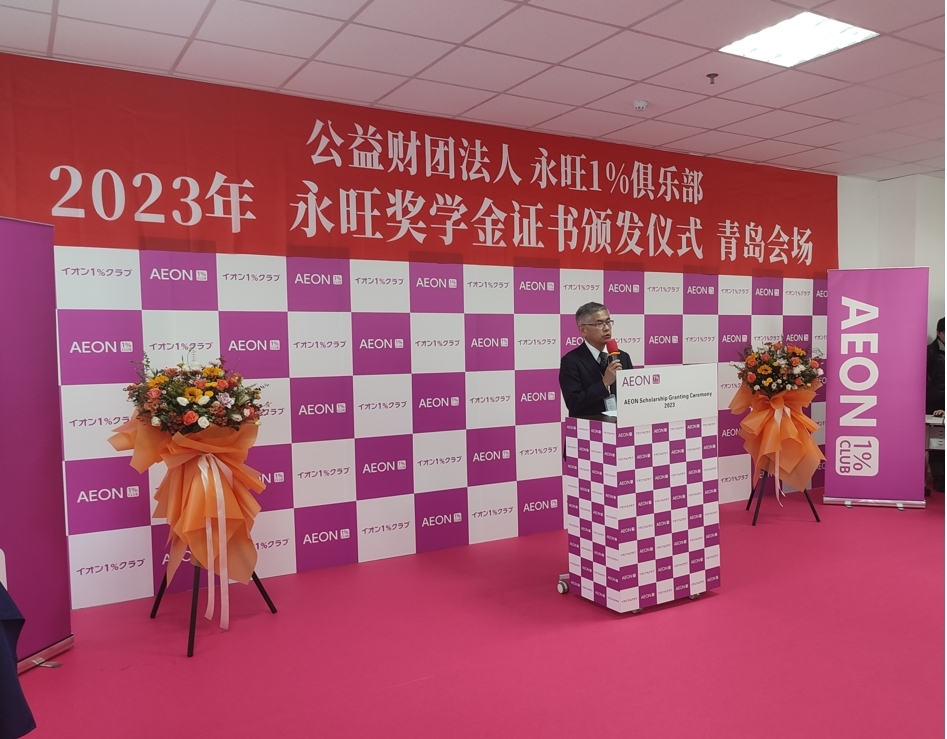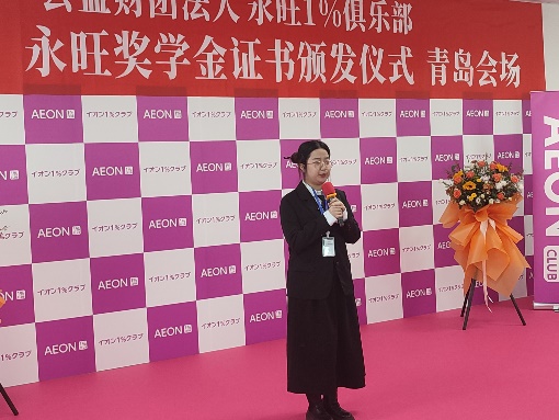 在隨后的證書頒發(fā)儀式上由公益財(cái)團(tuán)法人永旺1%俱樂部理事長森 美樹詳細(xì)介紹了永旺1%俱樂部的情況和永旺獎(jiǎng)學(xué)金的設(shè)立背景。日本國駐青島總領(lǐng)事館齋藤憲二總領(lǐng)事向獲得永旺獎(jiǎng)學(xué)金的同學(xué)表示祝賀希望同學(xué)們能夠通過學(xué)習(xí),用自己所學(xué)的知識(shí)做貢獻(xiàn)。