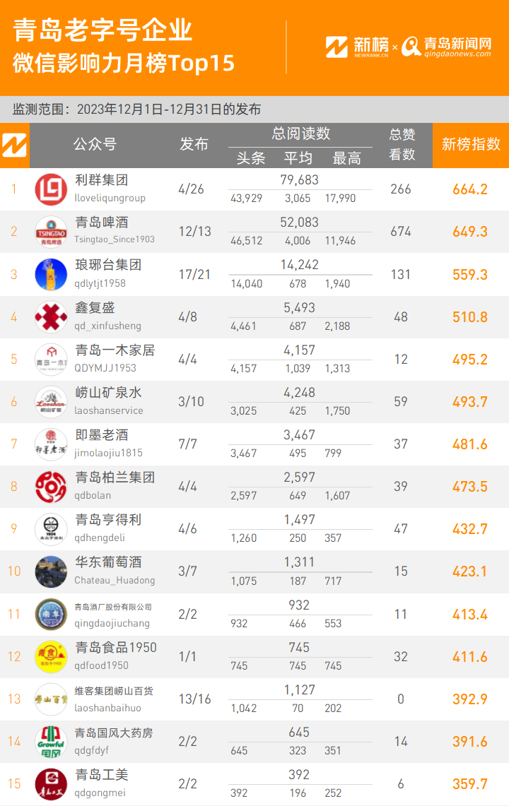 NO.12|權(quán)威發(fā)布:青島老字號(hào)企業(yè)微信影響力月度排行榜TOP15