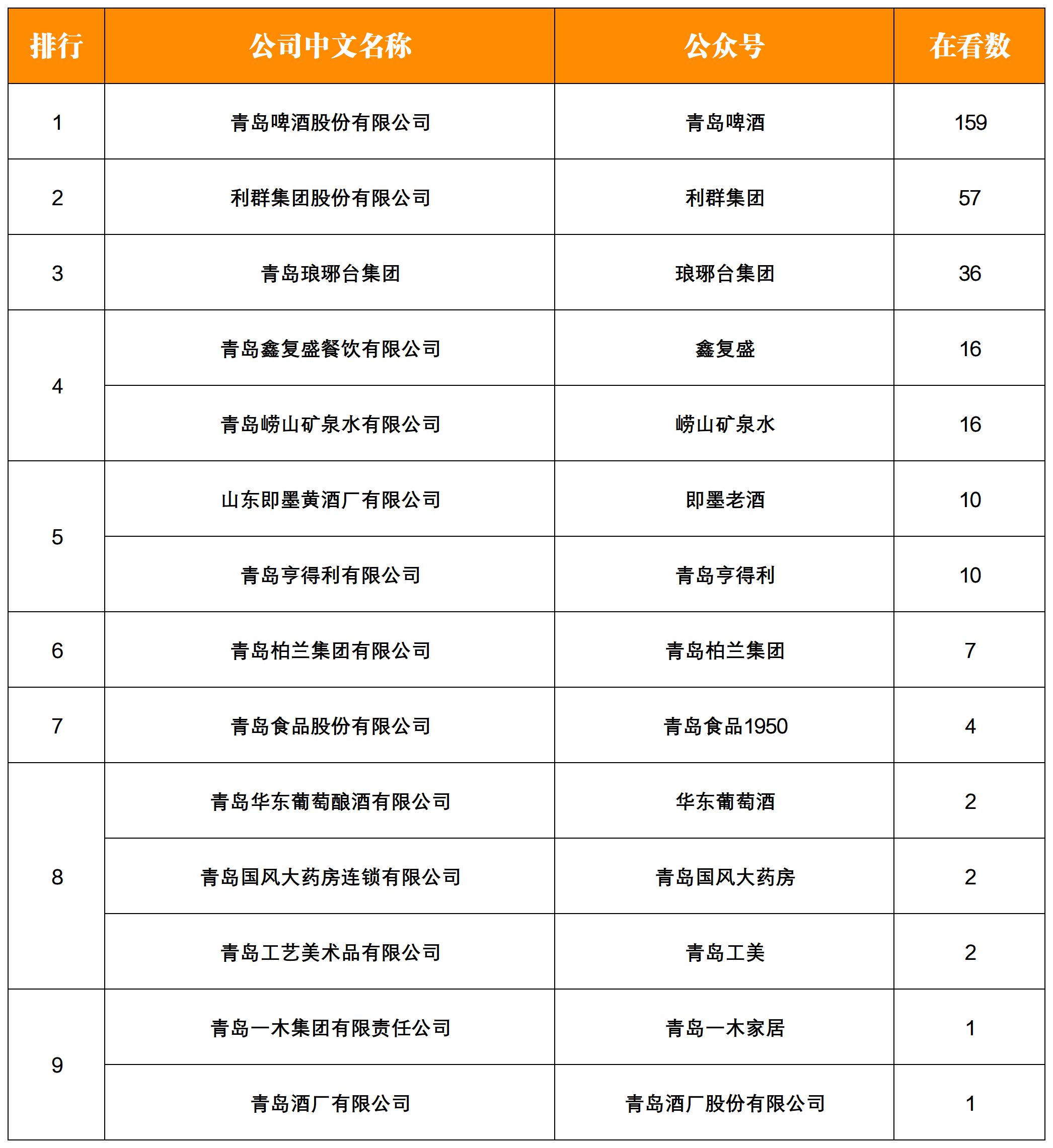 NO.9|權(quán)威發(fā)布:青島老字號(hào)企業(yè)微信影響力月度排行榜TOP15