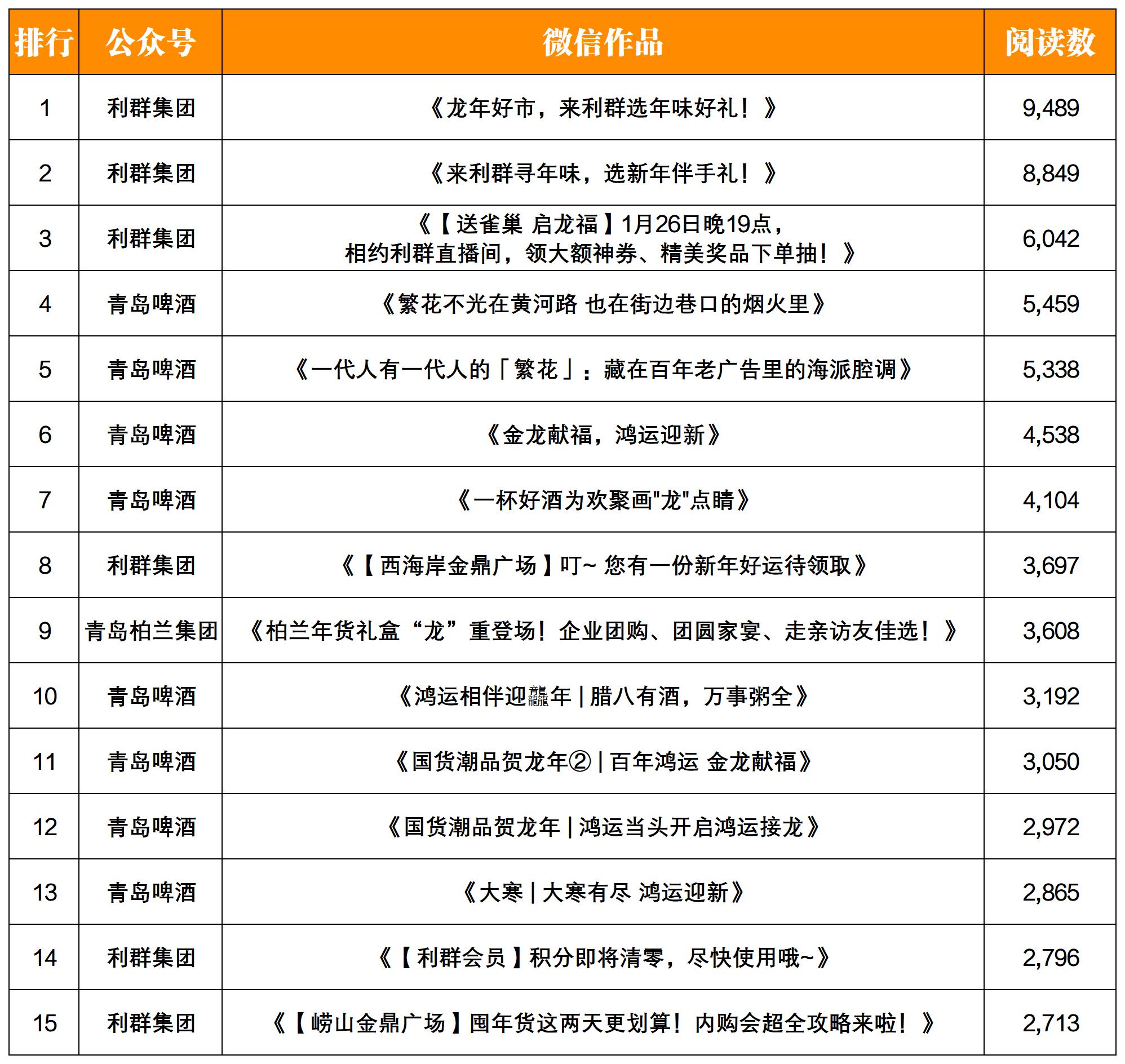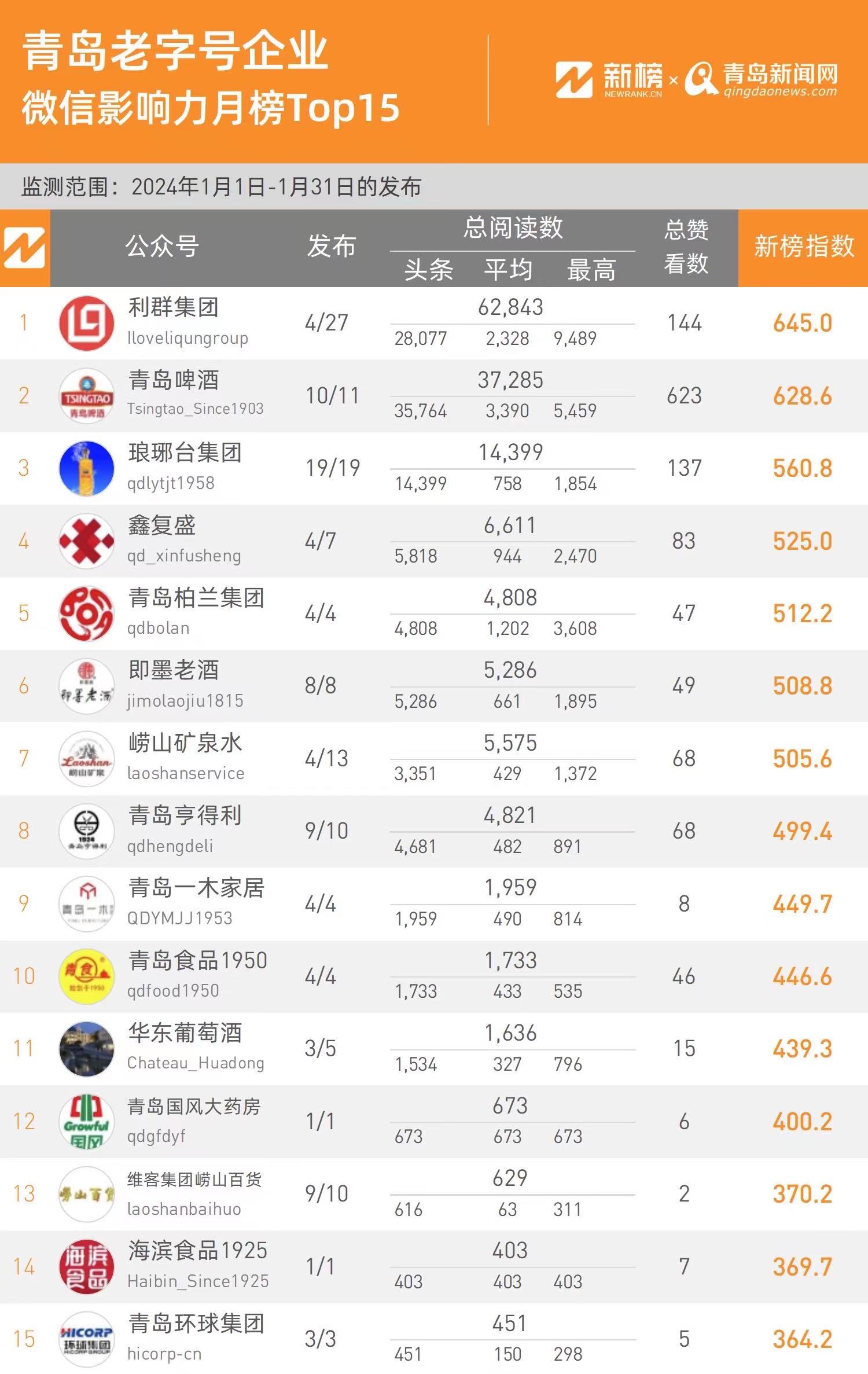 2024年1月青島老字號企業(yè)微信影響力排行榜TOP15即刻揭曉。本期榜單統(tǒng)計周期是2024年1月1日到2024年1月31日。