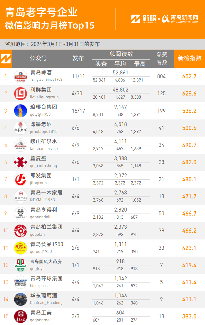 NO.1| 權威發(fā)布:2024青島老字號企業(yè)微信影響力月度排行榜TOP15