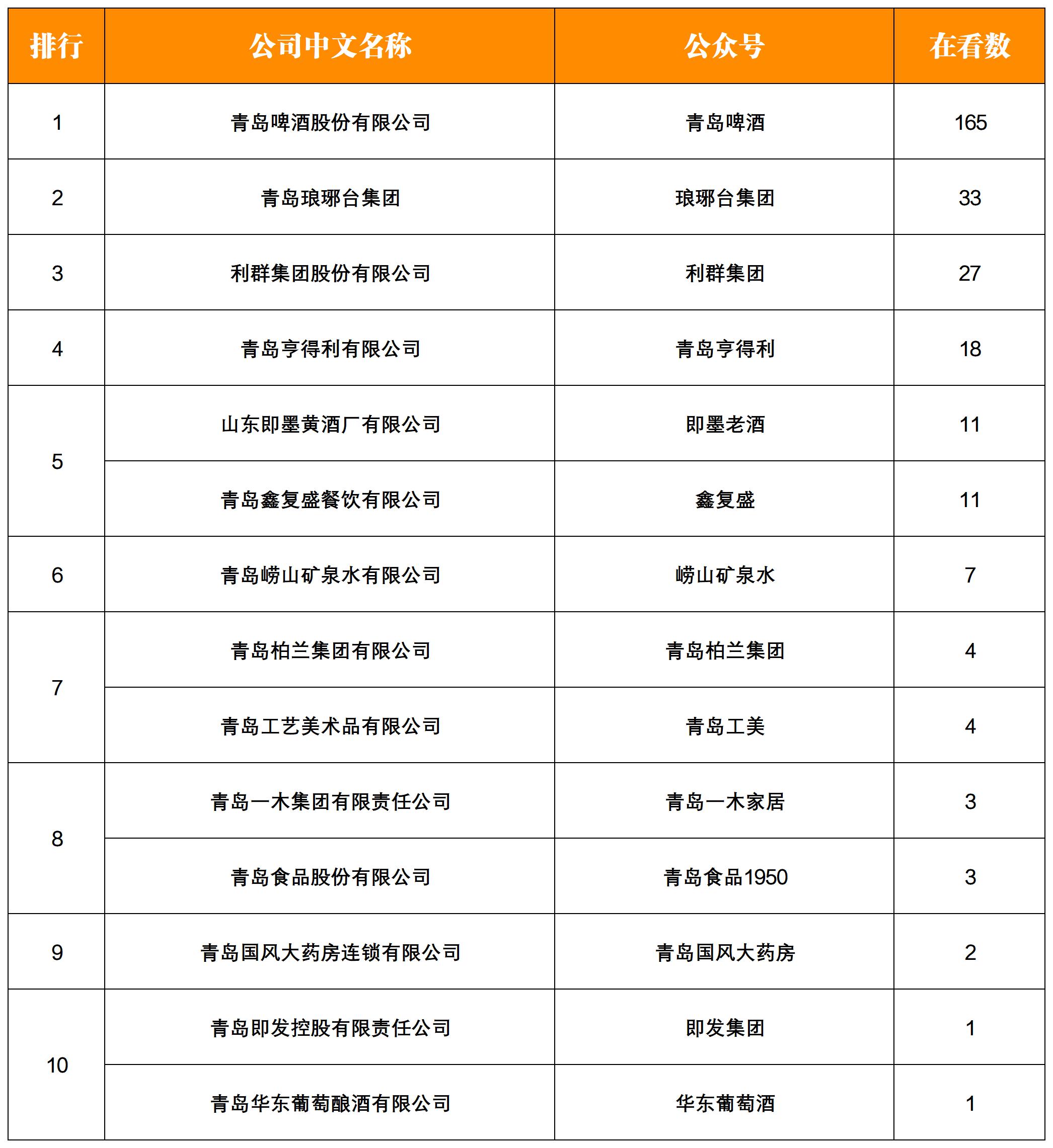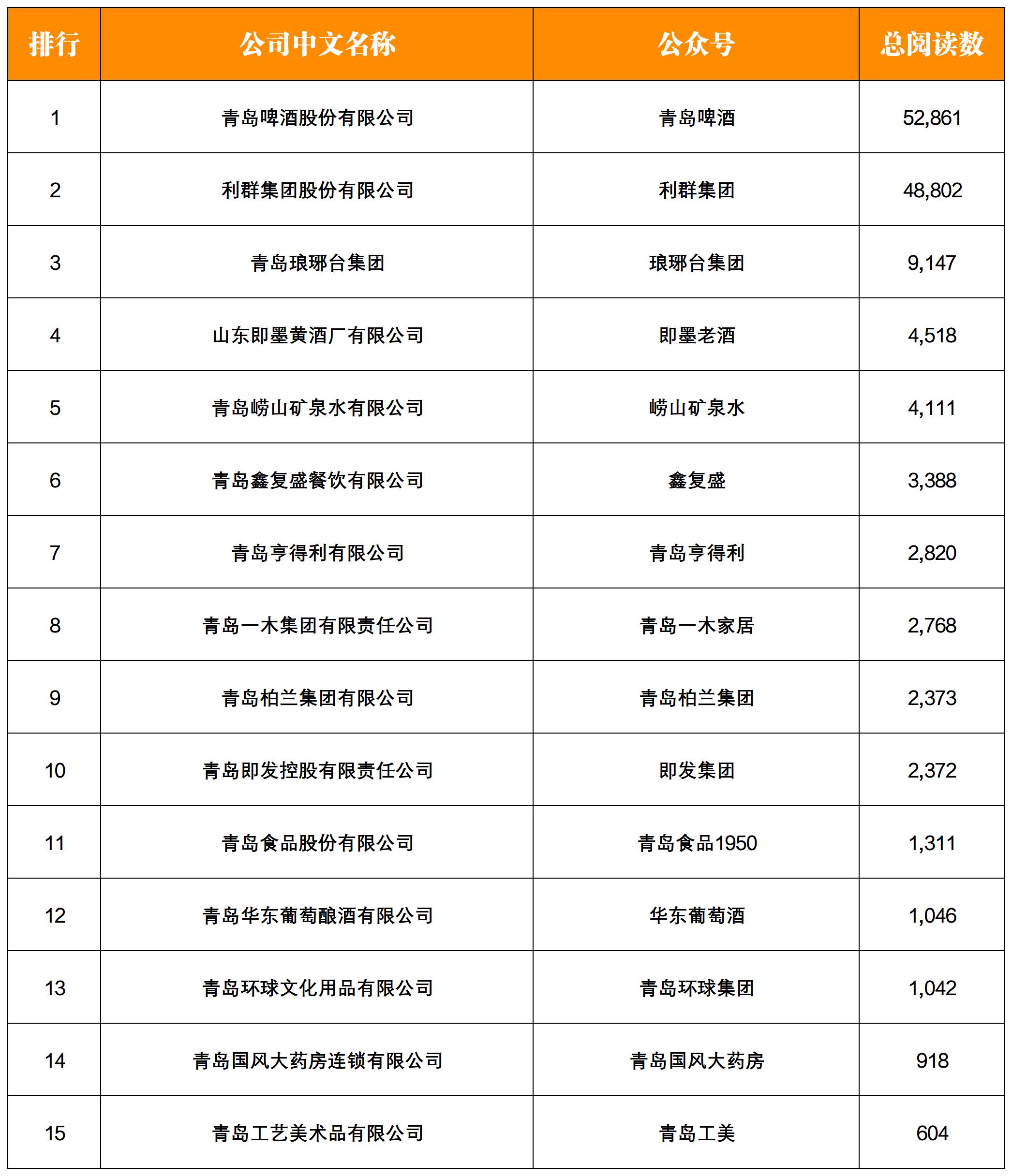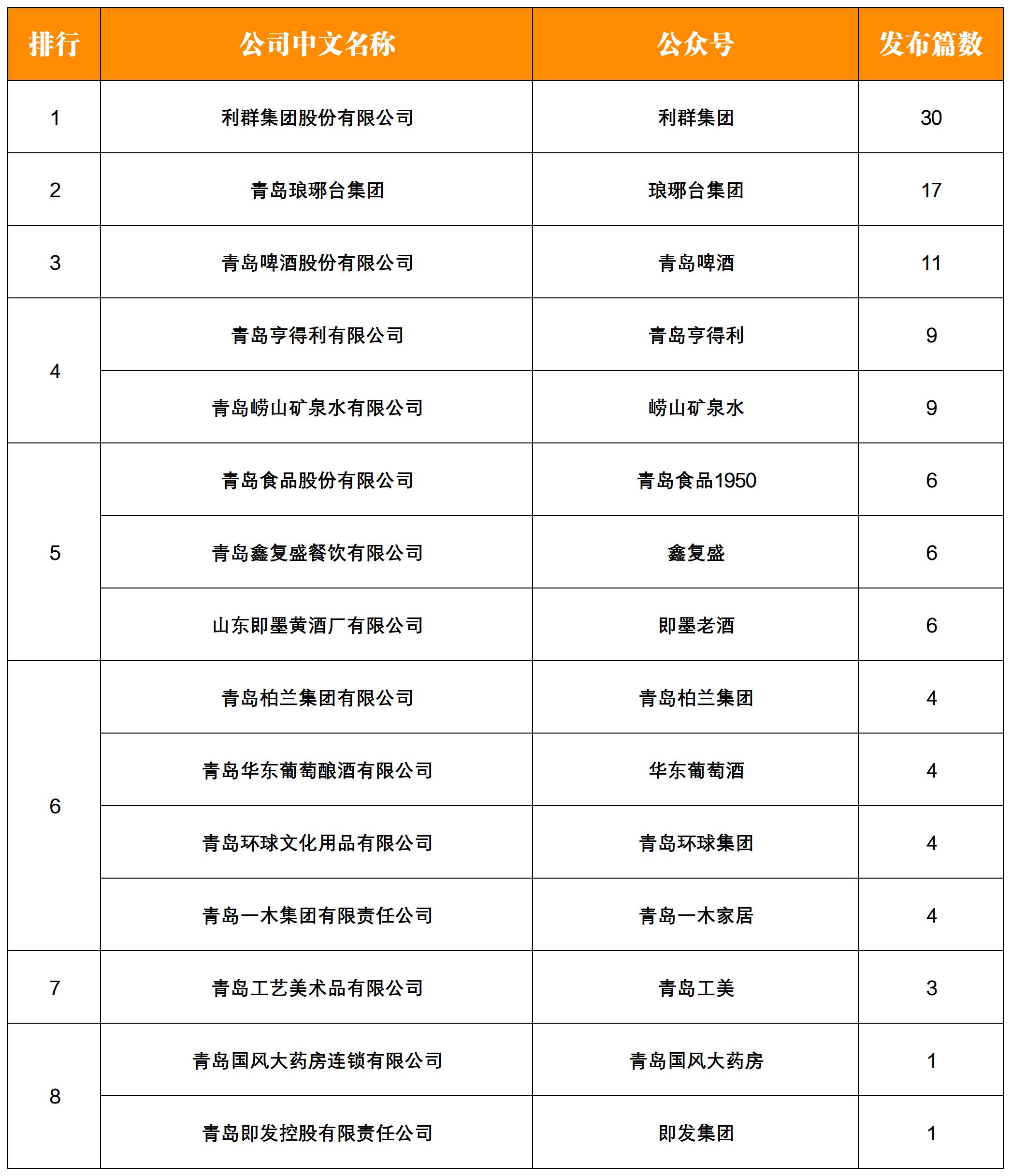 NO.10|權威發(fā)布:青島老字號企業(yè)微信影響力月度排行榜TOP15