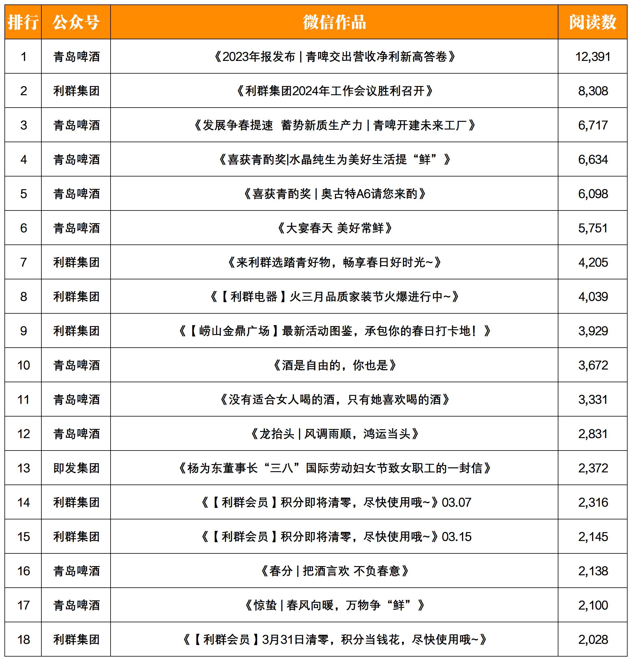 “青島啤酒”3月份發(fā)布文章11篇,總閱讀數(shù)5.2w+,經(jīng)過三期后又再次奪得榜單冠軍;“利群集團”3月份發(fā)布文章30篇,總閱讀數(shù)4.8w+,位于榜單亞軍;“瑯琊臺集團”3月份發(fā)布文章17篇,總閱讀數(shù)9000+,位于榜單季軍。