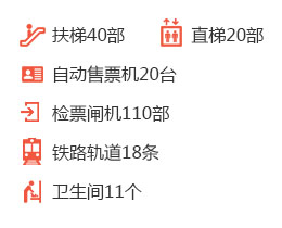北站共設(shè)置了扶梯40部,直梯20部,自動售票機20臺,檢票閘機110部,鐵路軌道18條,衛(wèi)生間11個,其中高架候車區(qū)有10個,觀景平臺有1個。
