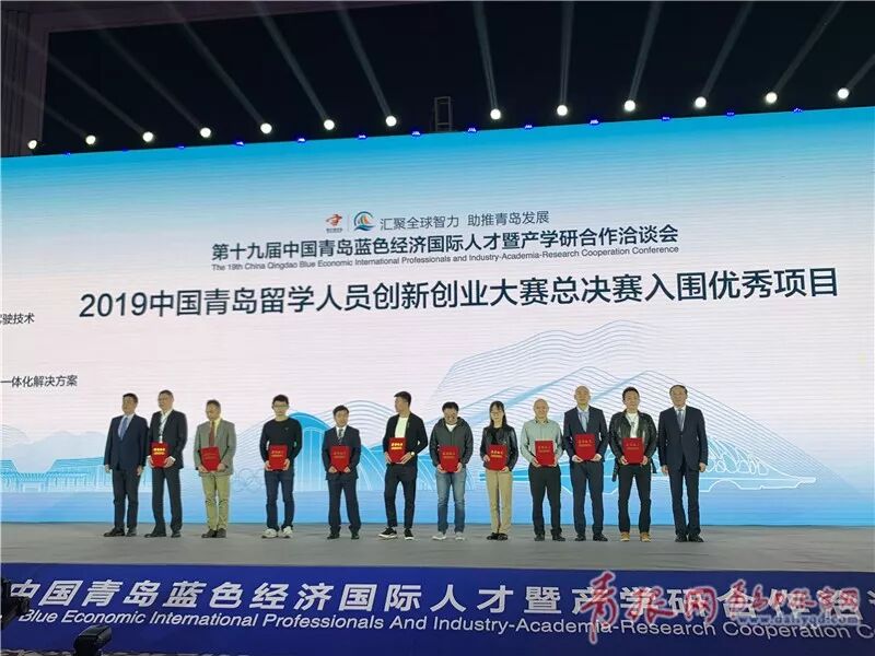 △第十九屆“藍(lán)洽會”為2019中國青島留學(xué)人員創(chuàng)新創(chuàng)業(yè)大賽總決賽獲獎人員頒獎。