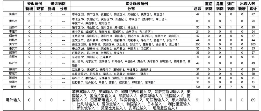 山東無(wú)新增本地疑似病例、確診病例。累計(jì)報(bào)告確診病例778例,死亡7例,治愈出院771例。