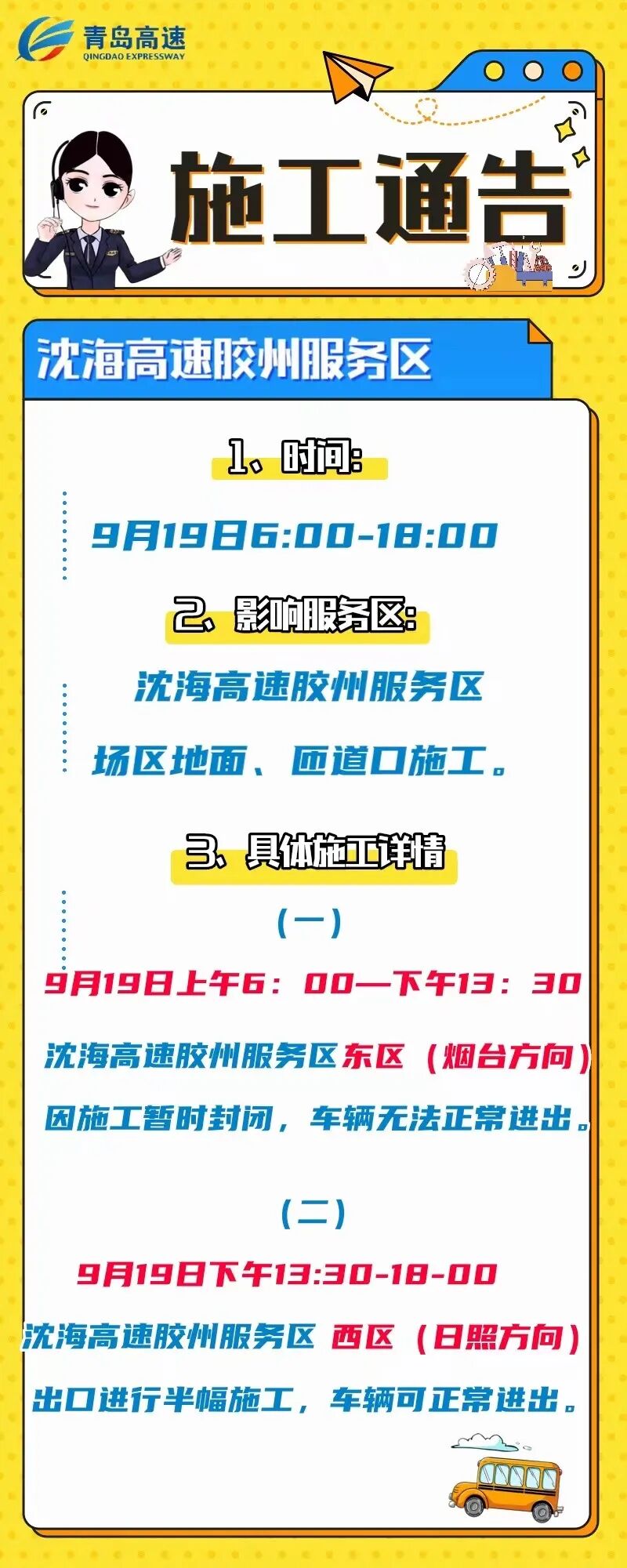 青島日報社/觀海新聞9月18日訊 今天,青島高速出行服務(wù)平臺微信公眾號發(fā)布沈海高速膠州服務(wù)區(qū)施工通告。9月19日6:00至18:00,沈海高速膠州服務(wù)區(qū)場區(qū)地面、匝道口施工,部分路線車輛無法正常進出。